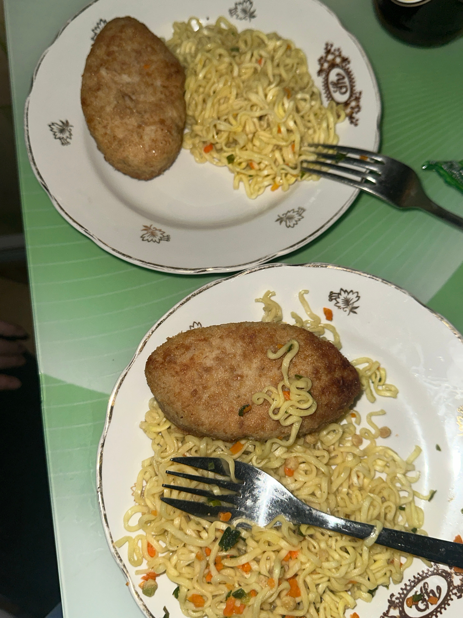 Two plates of food are positioned on a light green surface. Each plate contains a fried cutlet and a portion of instant noodles, with forks placed on top of the food. The plates feature a white backgr…read more