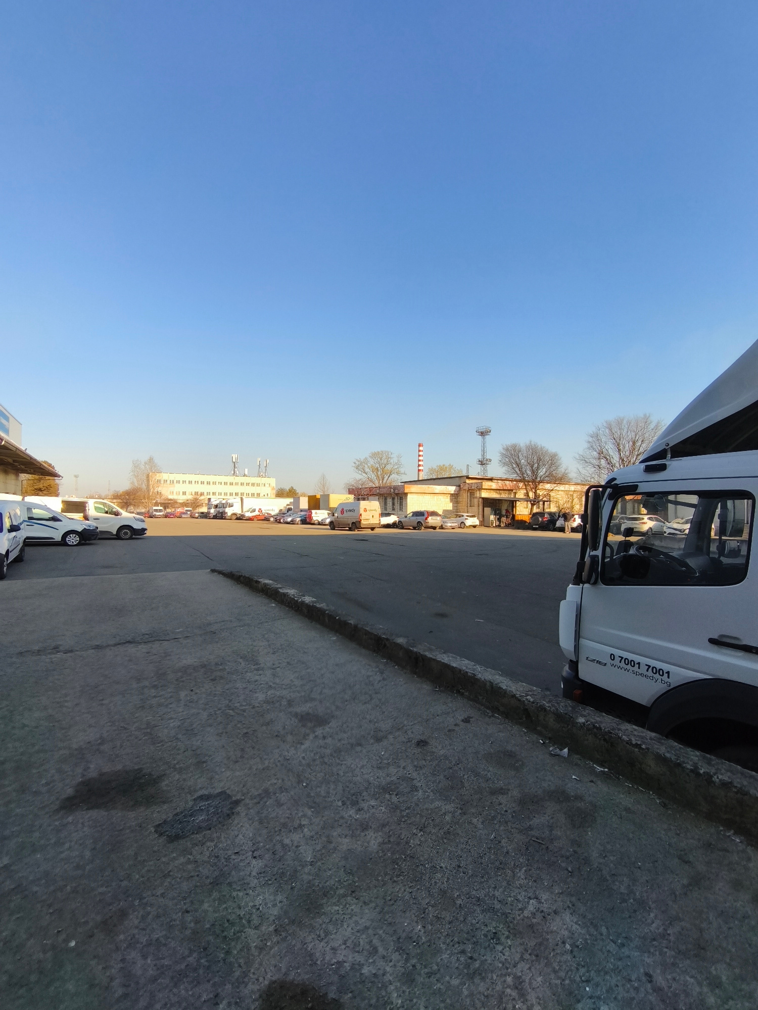 The image depicts an outdoor parking lot scene in what appears to be an industrial or commercial area. The sky is clear and blue. The foreground shows a concrete surface leading to a curb. A white van…read more