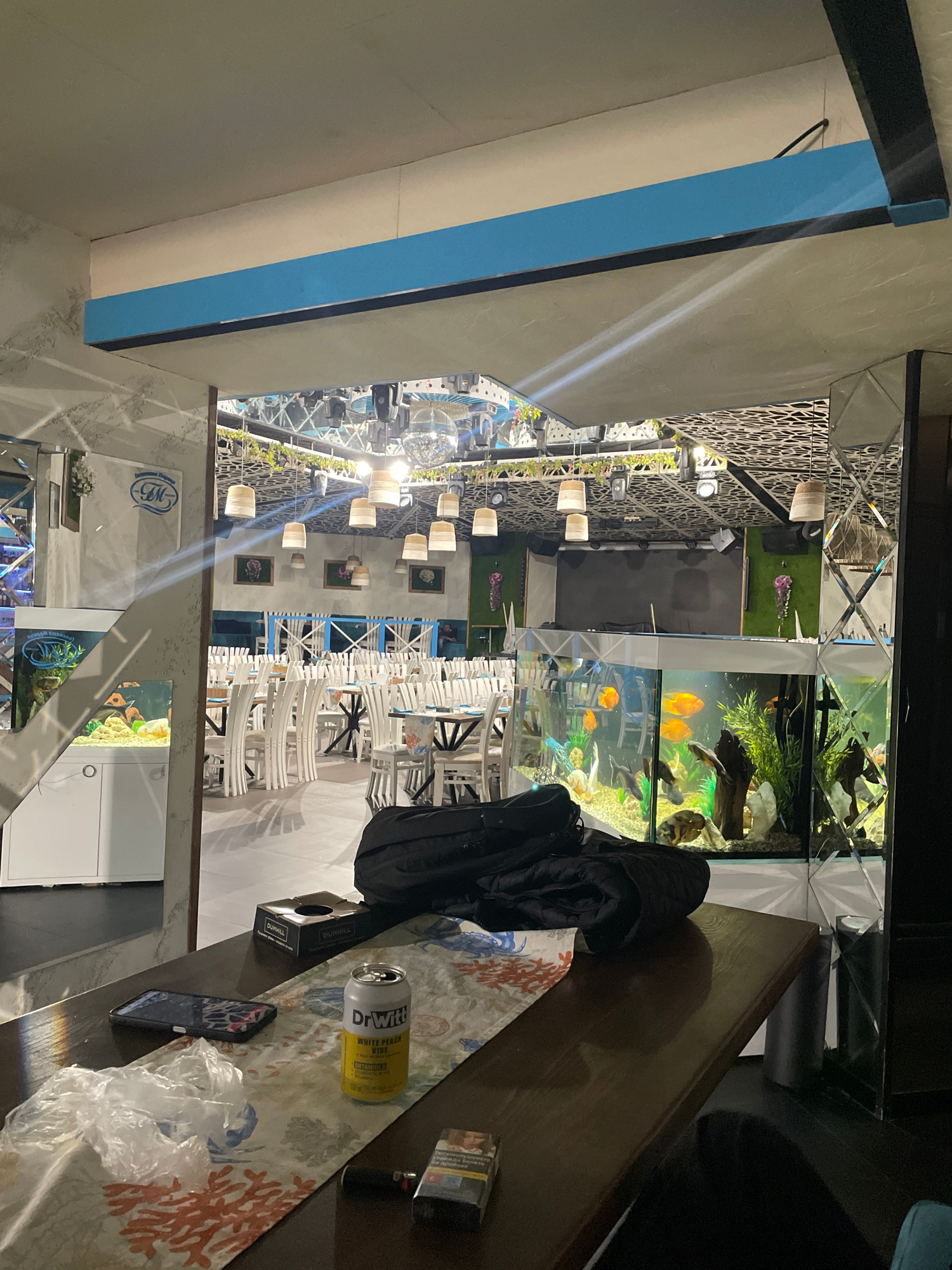 The image, captured in Plovdiv, Bulgaria, presents an indoor commercial space, likely a restaurant or lounge, illuminated by artificial light, suggesting evening or night. The perspective is from a ta…read more