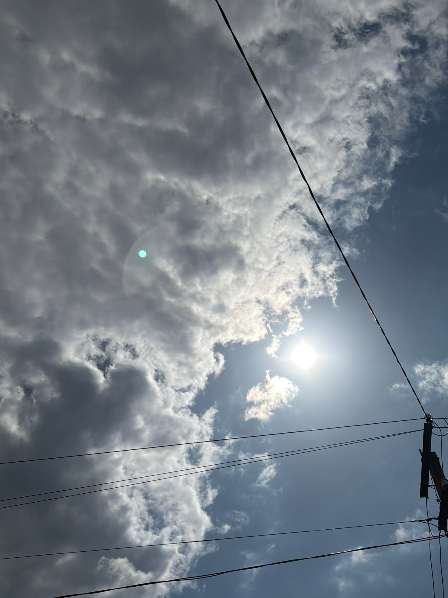 This media file presents an upward view of a bright, partly cloudy sky, characteristic of daytime conditions in Novopokrovskaya, Russia. The sun, a brilliant white orb, is prominently located in the u…read more