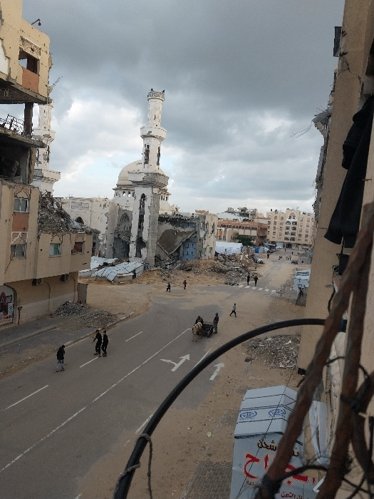 The image depicts a street scene in Khan Yunis, Palestinian Territory, under an overcast sky. The foreground is partially obscured by dark wires and a brown metal frame. To the immediate right, a heav…read more