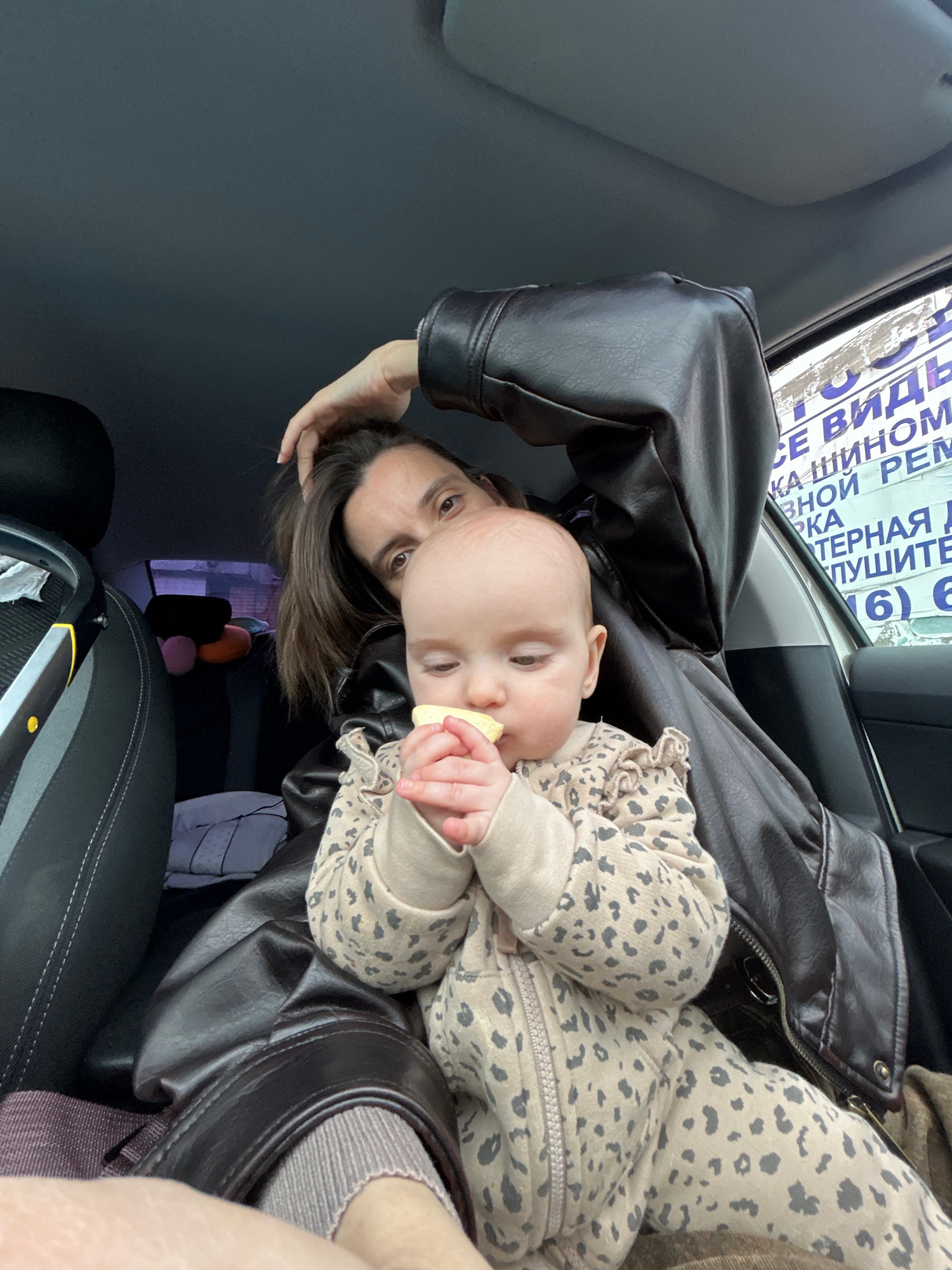 A baby in a leopard-print onesie is being held by a woman in a car. The woman is wearing a brown leather jacket. The baby is holding a piece of food in its hand. The car is parked in Moscow, Russia. A…read more