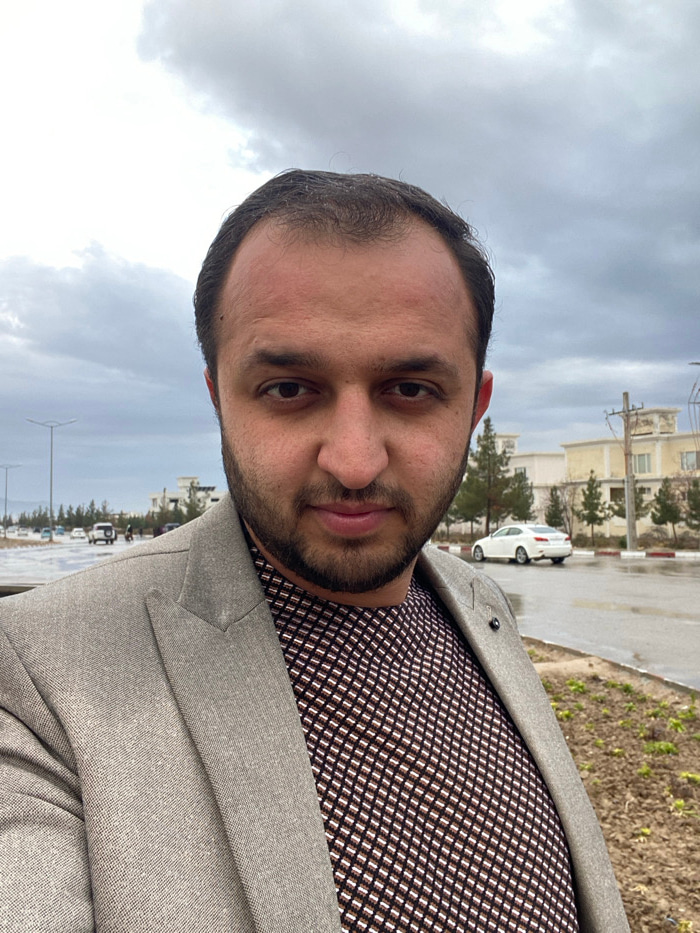 A man poses in front of a drab, overcast sky. He has dark hair, a beard, and brown eyes. He wears a patterned shirt and a grey blazer. Behind him, there's a street with wet pavement, a few buildings,…read more