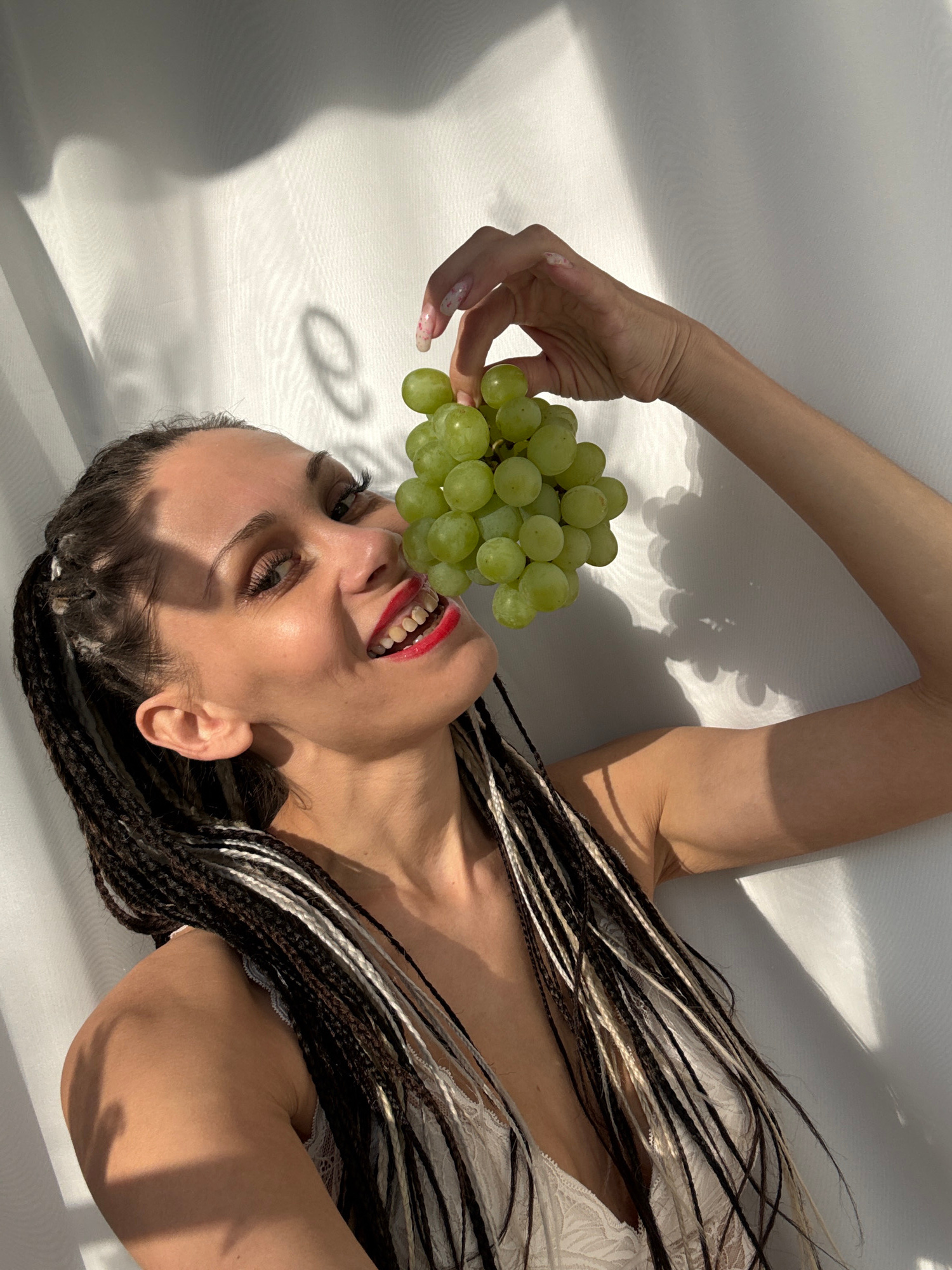 A woman is lying on a white surface, holding a bunch of green grapes near her mouth. She has black and white braids and is wearing a white lace top. She is looking up at the grapes with her mouth slig…read more