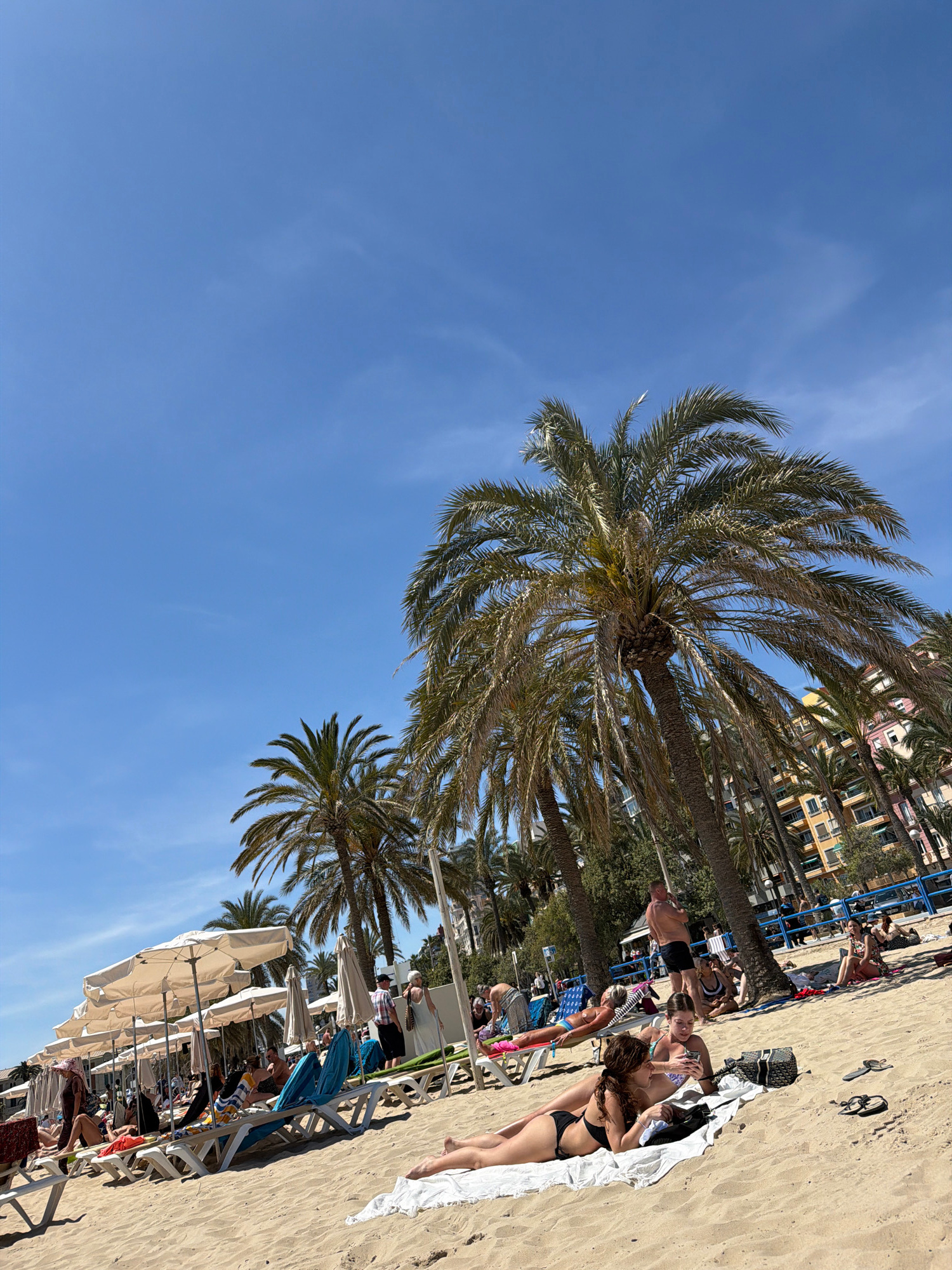 This image depicts a sunny day at a vibrant beach in Alicante, Spain, captured from a low angle looking towards the shore. A vast expanse of clear blue sky with only faint wisps of clouds dominates th…read more