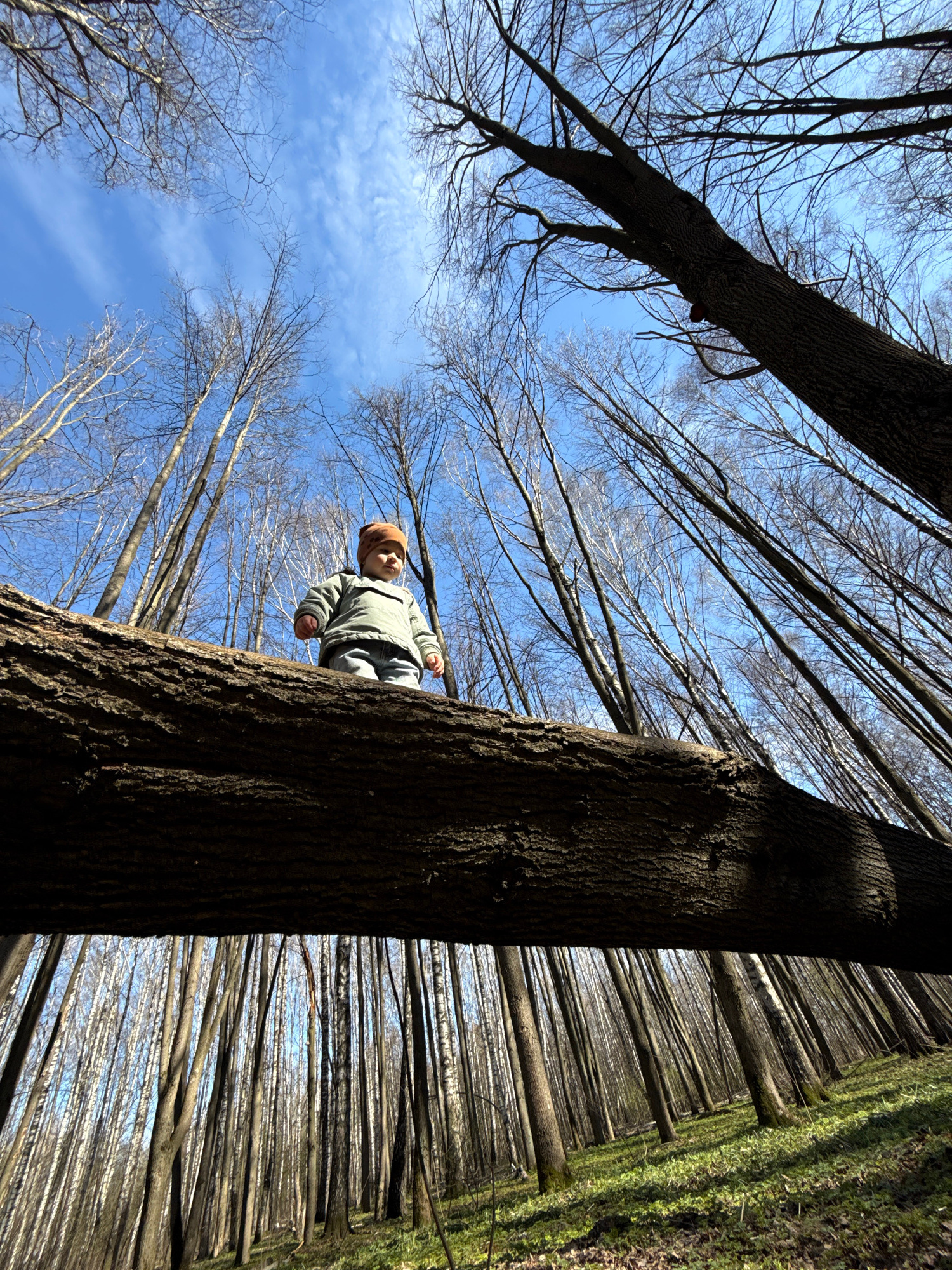 The image is taken from a low-angle perspective in a forest-like setting, likely in Rusanovo, Russia. The blue sky is visible through bare tree branches. A young child in a jacket and hat is positioneβ¦read more