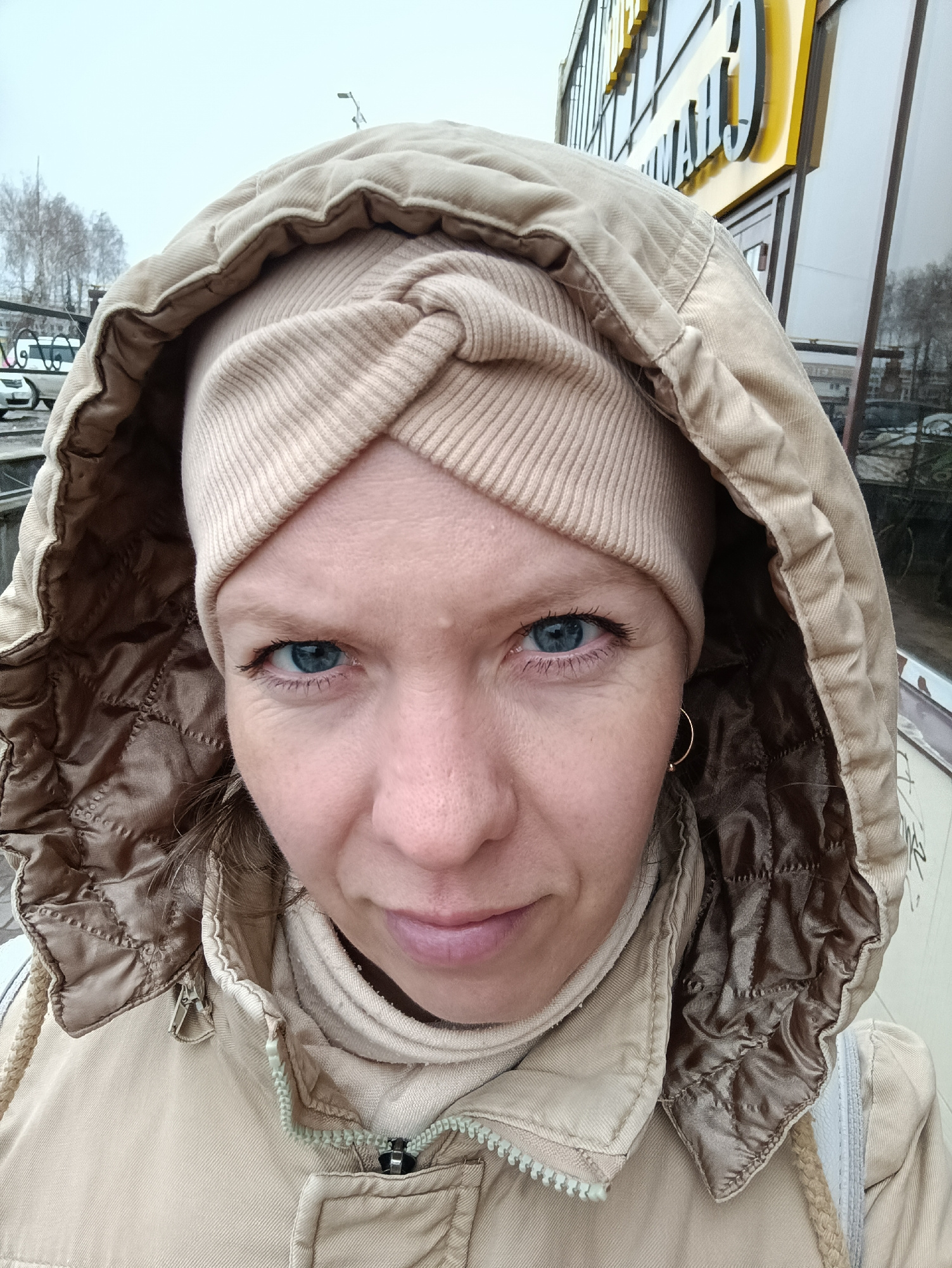 A close-up, eye-level selfie captures a woman outdoors, looking directly at the camera with piercing blue eyes and a neutral expression. She is dressed in warm clothing, including a light beige hooded…read more