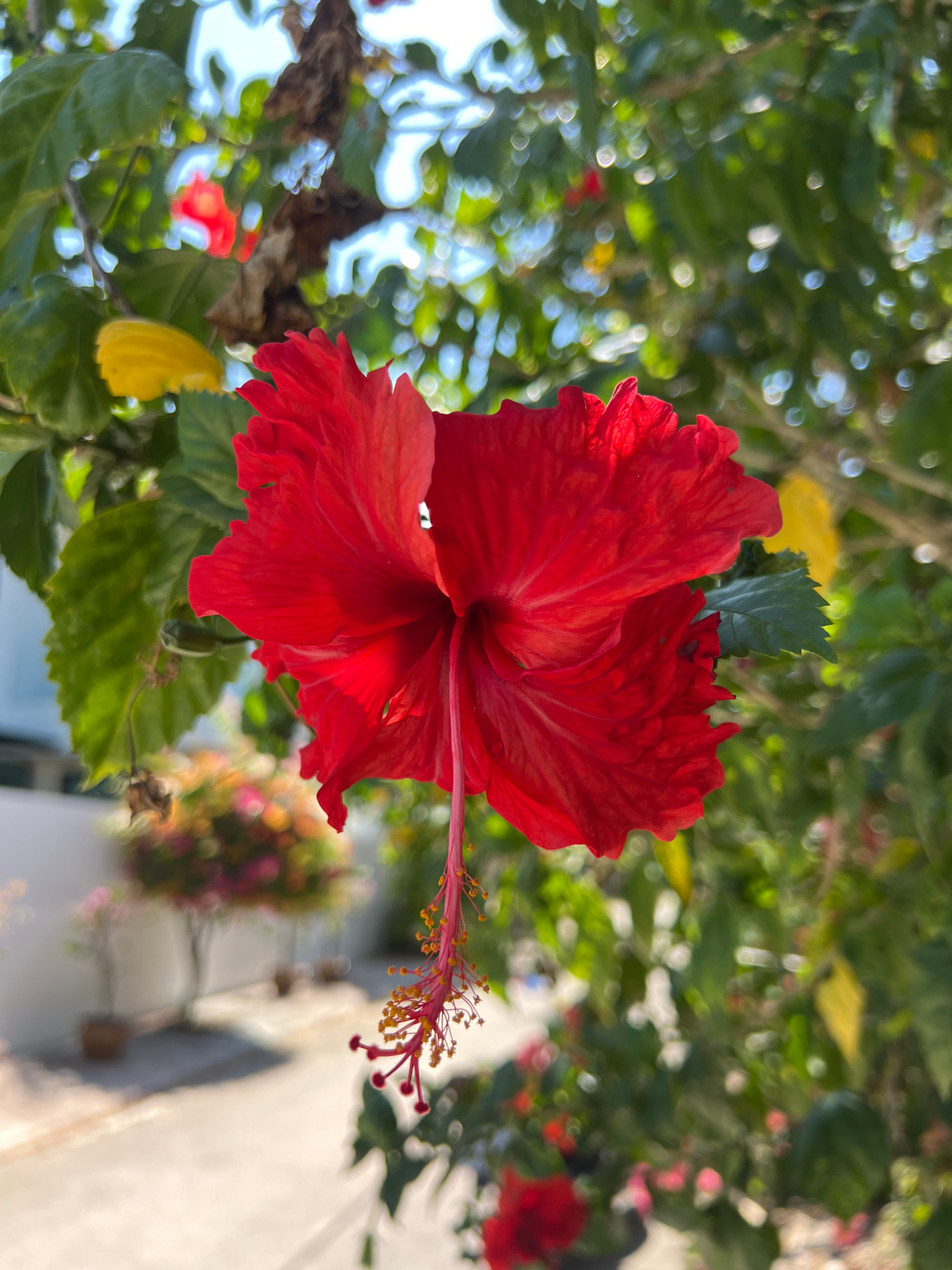 A close-up photograph captures a vibrant red hibiscus flower in full bloom against a blurred background of green foliage and a building façade. The flower is the focal point, showcasing its intricate…read more