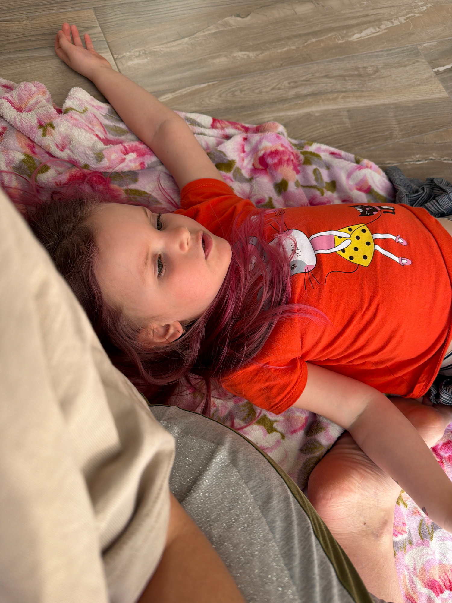 A young girl with reddish-purple hair is lying on her back on a pink and white floral patterned towel, which is on a light brown wood-look floor. She is wearing an orange t-shirt with a cartoon rabbit…read more