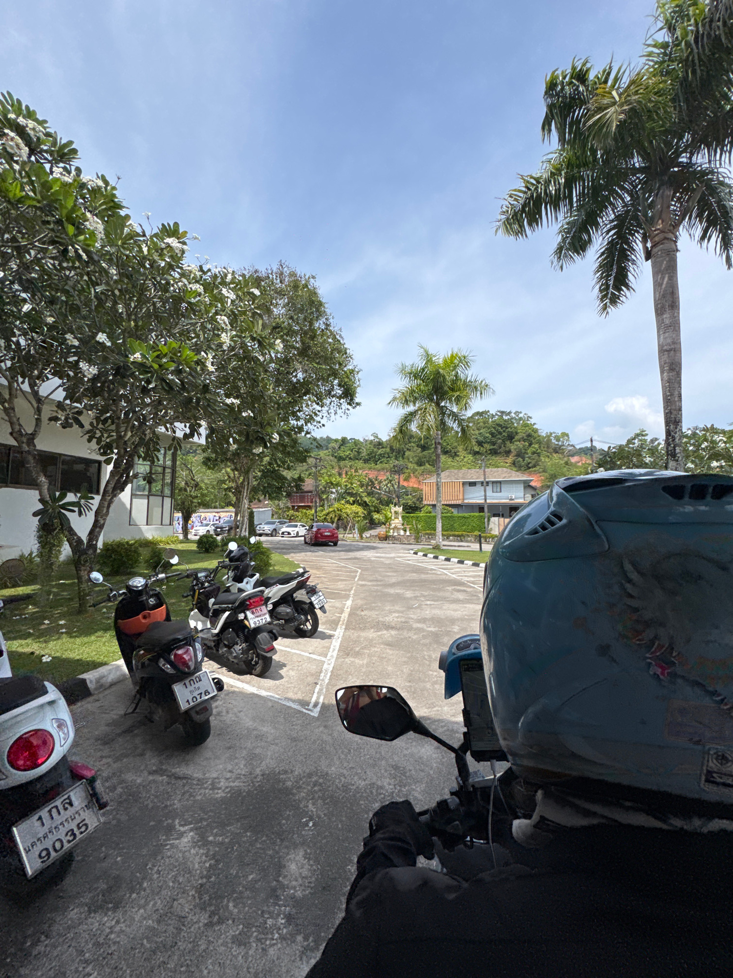 The image depicts a parking area in Kathu, Thailand, filled with motorcycles parked in designated spaces. A helmet is positioned prominently in the foreground, possibly belonging to the photographer o…read more