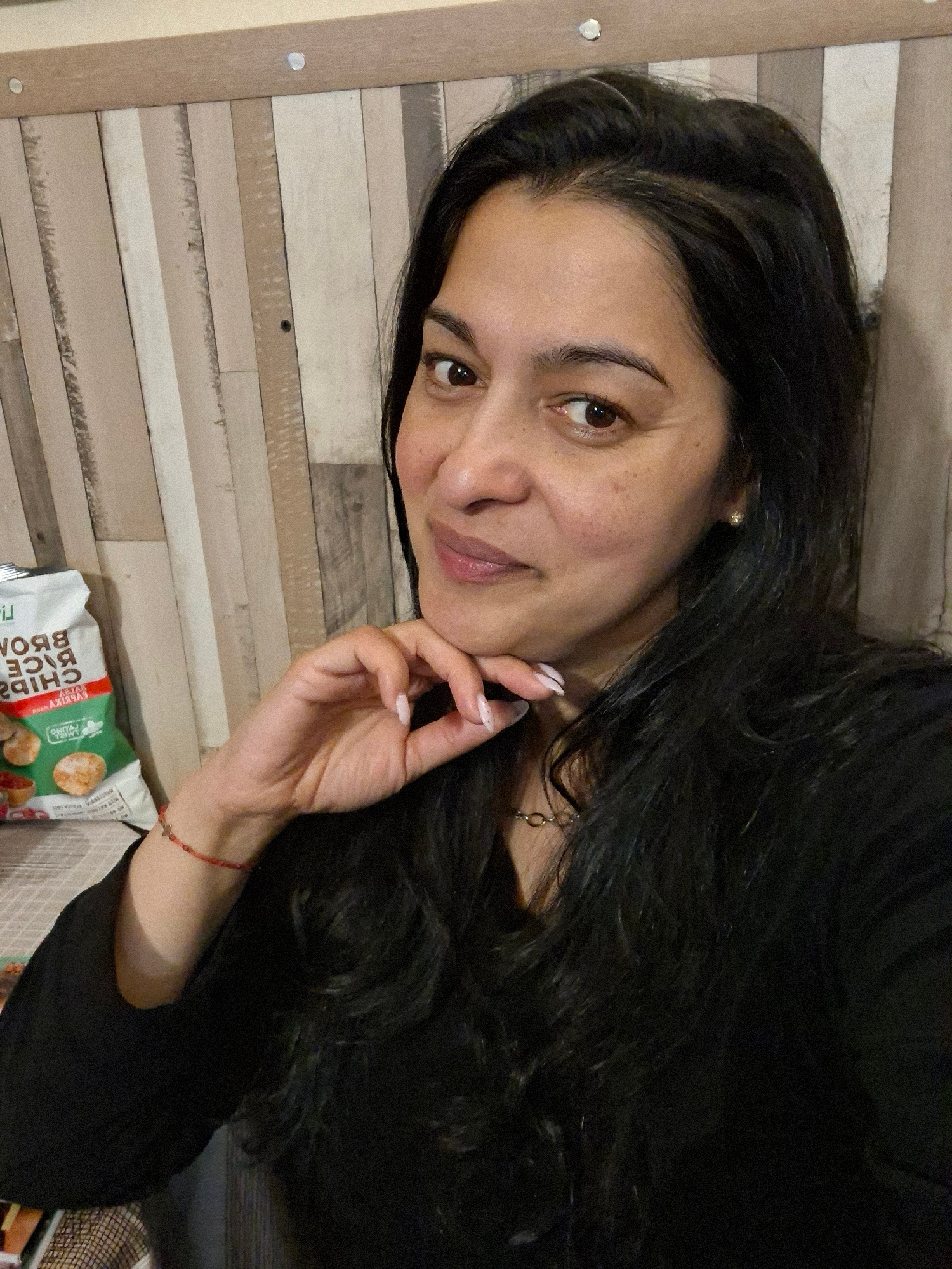 A woman with dark, long hair and light skin is lying down on a surface that resembles a light-colored wooden paneling. She is wearing a dark-colored top and has a red bracelet on her left wrist. Her l…read more