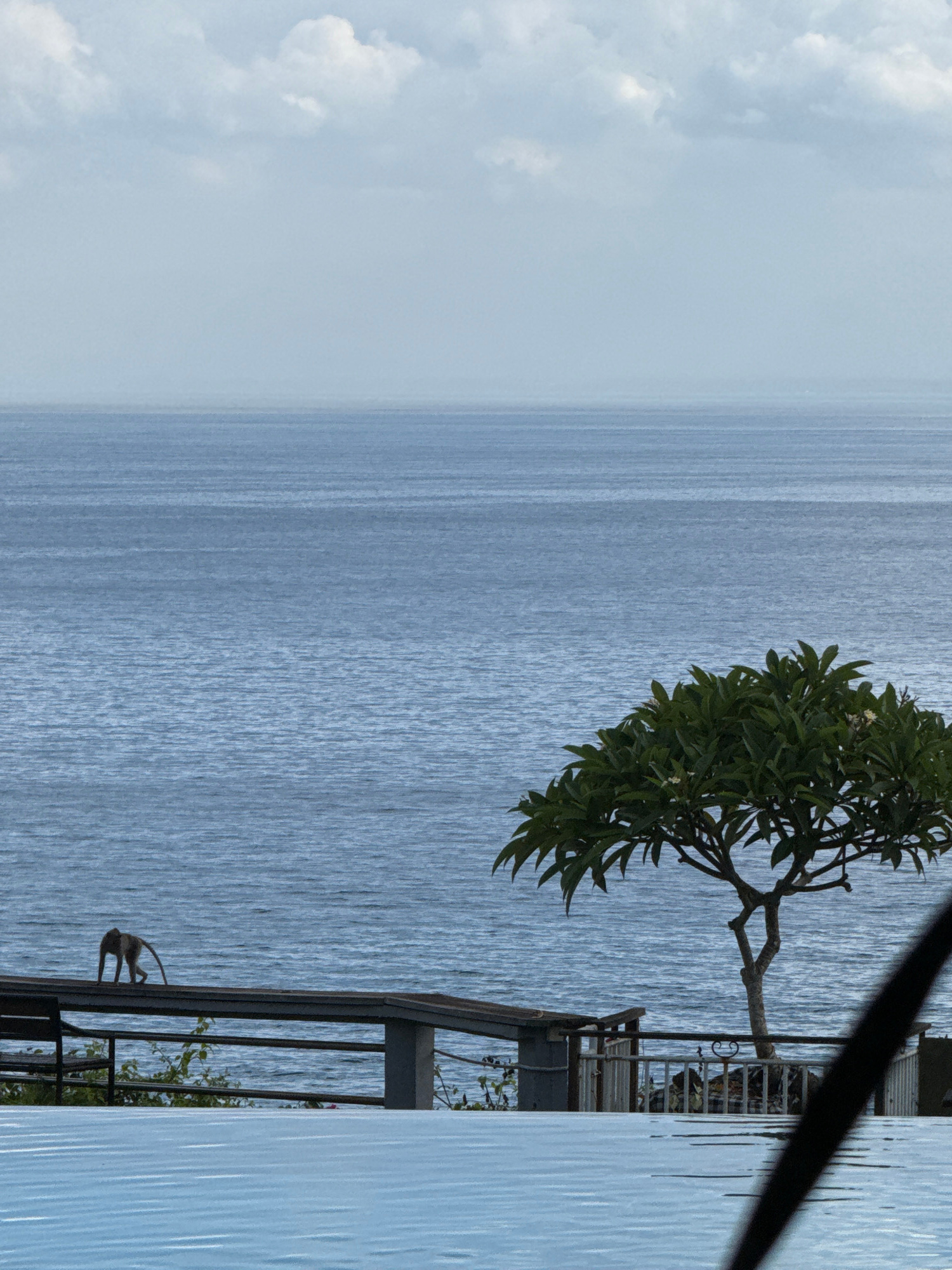 This image, oriented correctly, presents a serene daytime view overlooking a vast body of water, likely the ocean, under a soft, cloudy sky. The upper portion of the frame features a light blue sky do…read more