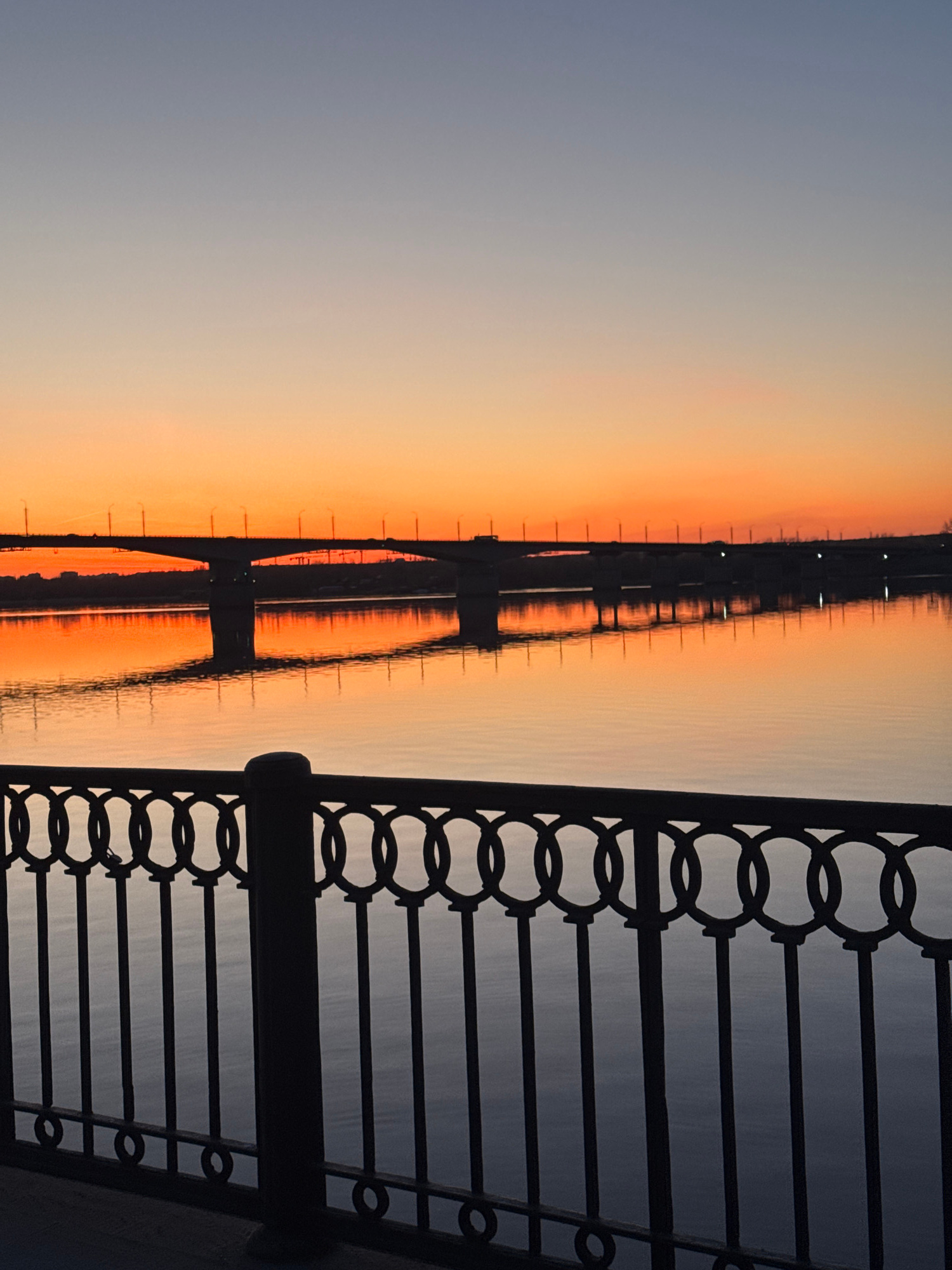 The image shows a view of the Kama River at sunset in Perm, Russia. A decorative black metal railing with circular and linear elements is visible in the foreground. Beyond the railing, the orange and…read more