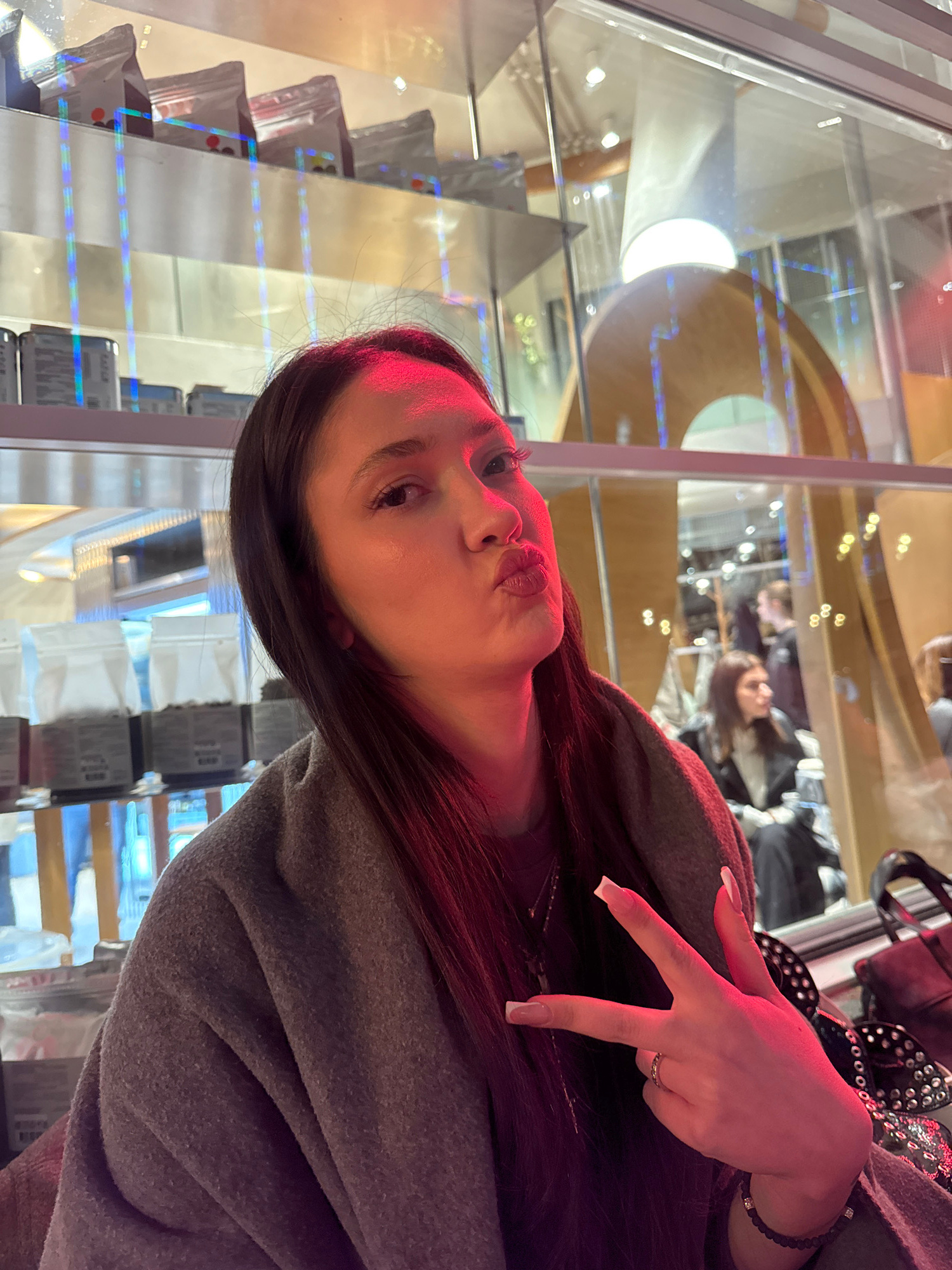 A woman with long brown hair, wearing a gray sweater and a ring on her finger, poses and makes a peace sign in front of a glass display. Her lips are puckered in a kiss pose. Behind her, the display f…read more