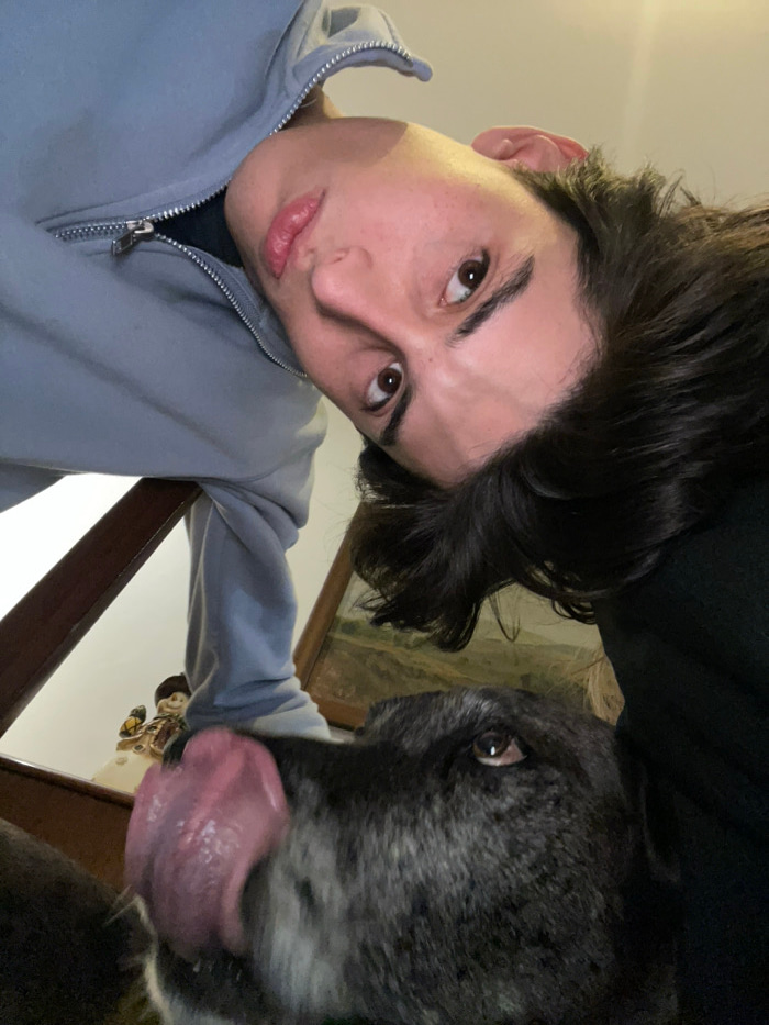 A selfie captures a young man and his dog. The man has dark hair and light skin, wearing a light-colored zip-up hoodie. His face is in focus, with brown eyes looking directly at the camera. Beside him…read more