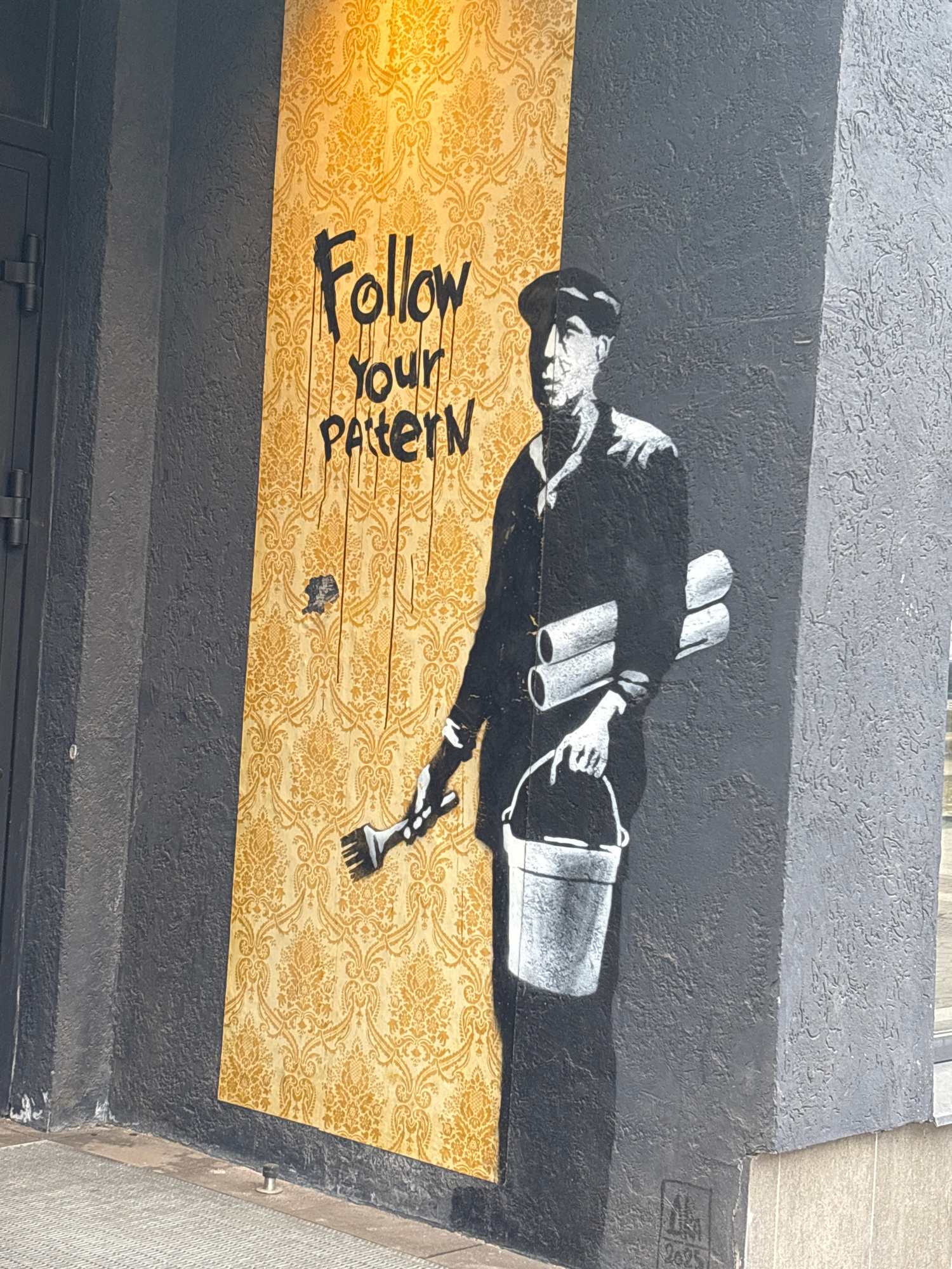 A mural is painted on a building exterior, likely in Izhevsk, Russia. The mural depicts a man in a hat holding blueprints and a paint bucket. He is painting a patterned background with the phrase "Fol…read more