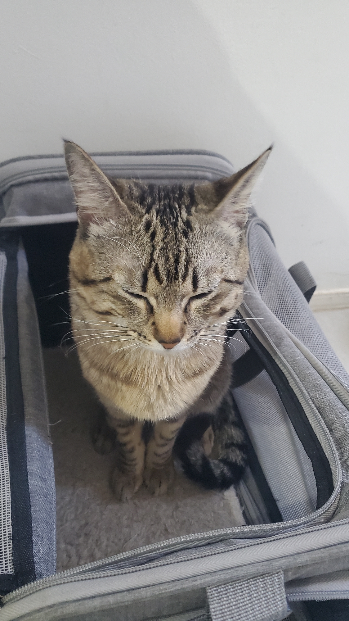 A domestic tabby cat is depicted sitting calmly with its eyes closed inside an open, grey, soft-sided pet carrier. The cat features light brown fur with distinct dark brown and black mackerel stripes…read more