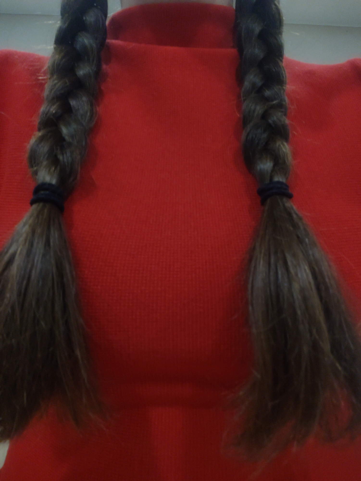 A person wearing a red turtleneck sweater has two brown braids, each secured with a black elastic band at the bottom. The braids hang down in front of the sweater. The setting or location is unspecifi…read more
