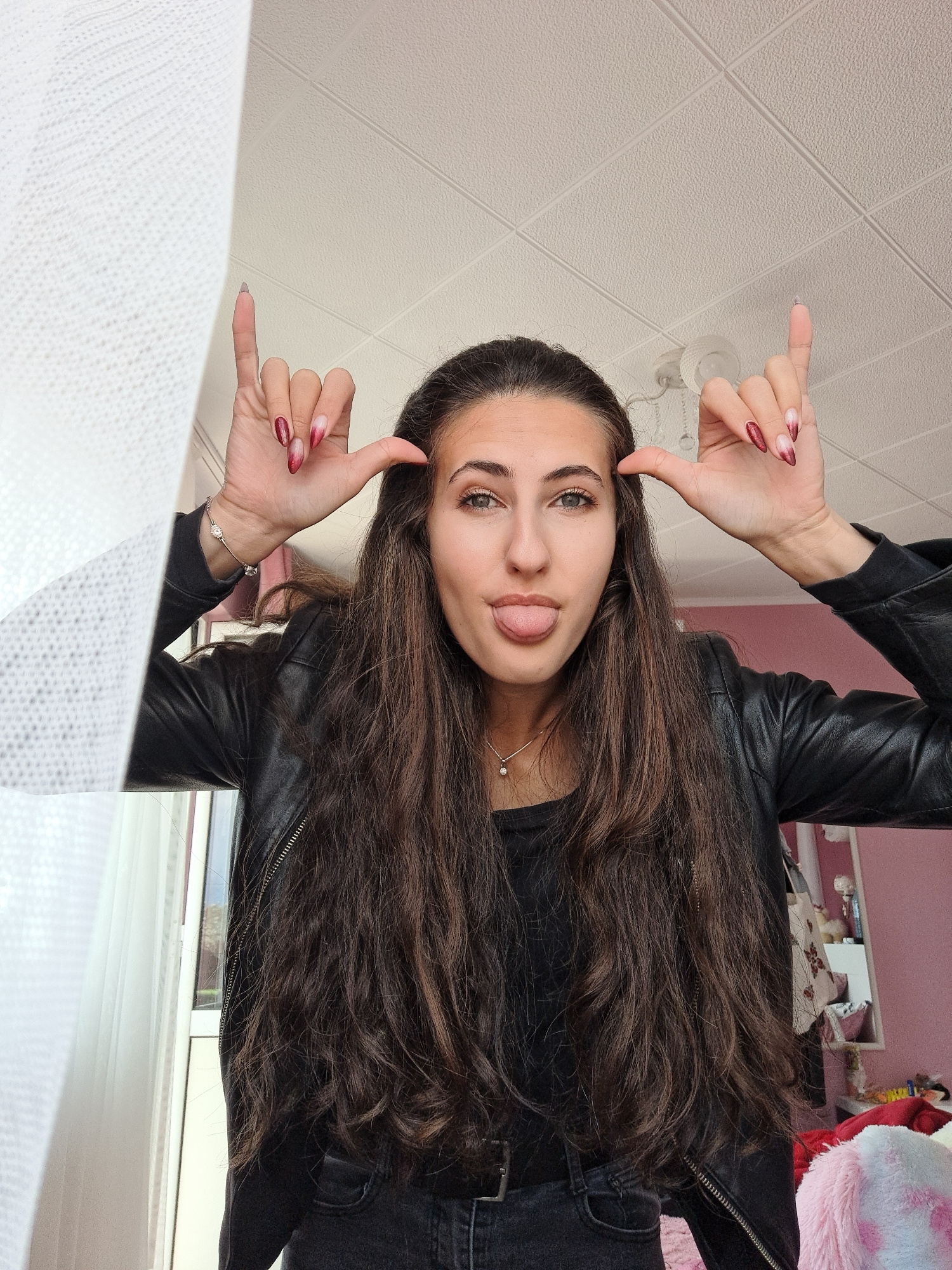 A young woman with long, wavy brown hair is posing indoors. She wears a black leather jacket and a black top. She is sticking her tongue out and making the "hang loose" hand gesture with both hands, p…read more