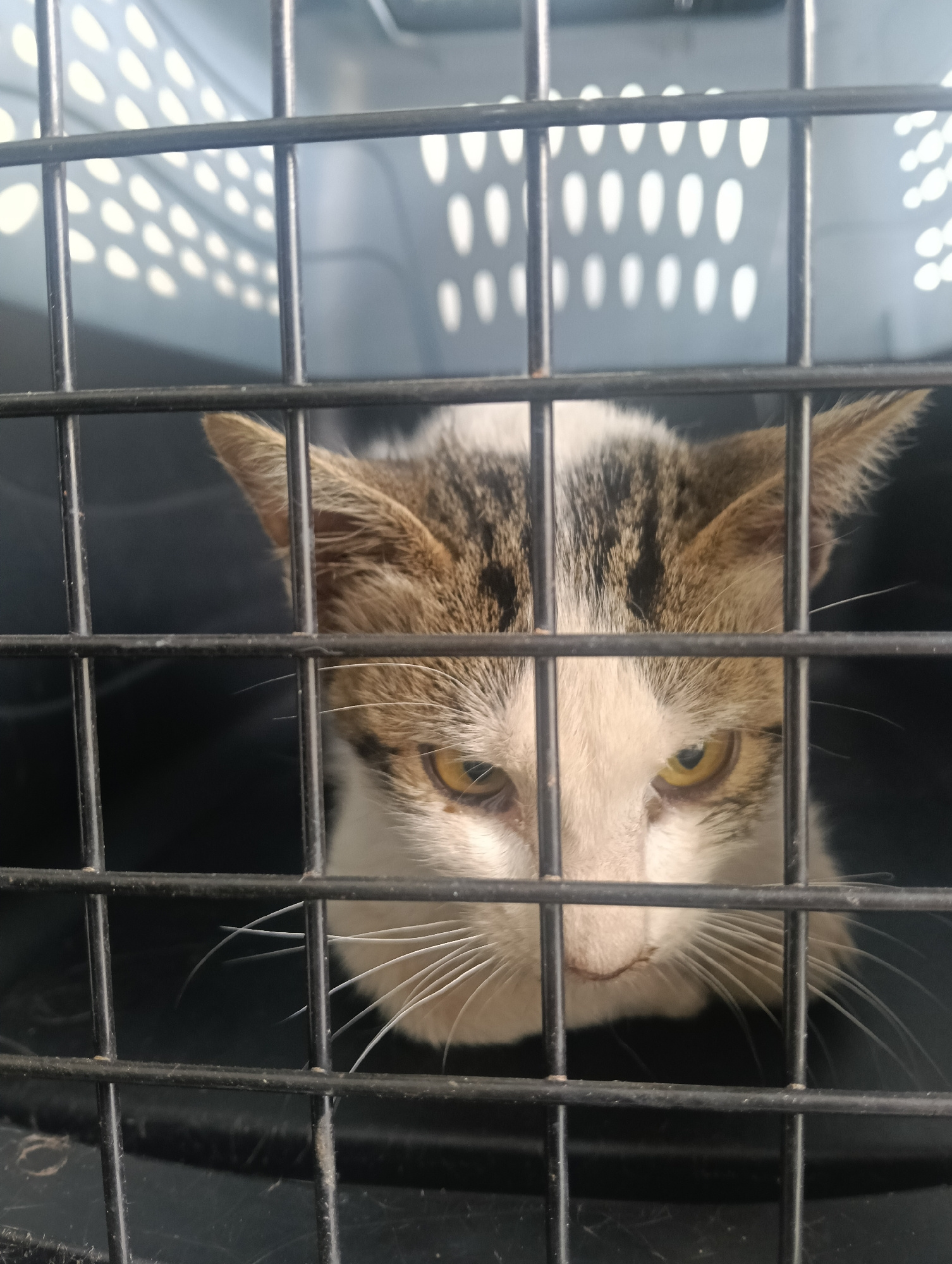 A cat with white and brown markings is enclosed in a dark metal cage. The background indicates the cage is inside a carrier. The location is unknown and could not be deduced from the image.
