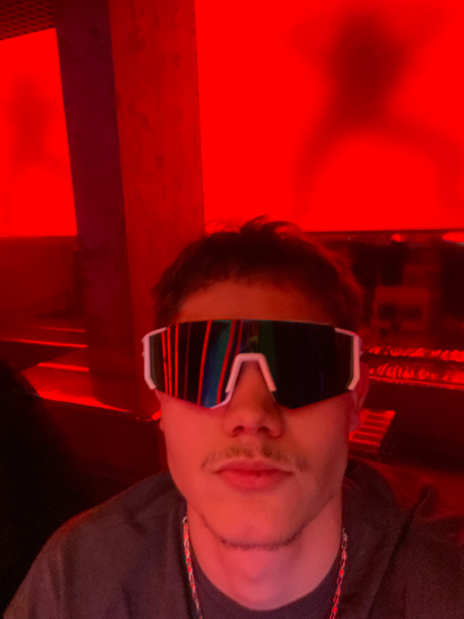 A man wearing large, futuristic white sunglasses with a reflective, striped lens is positioned in the foreground of a vertically oriented photograph. The image is dominated by red lighting. The man ha…read more