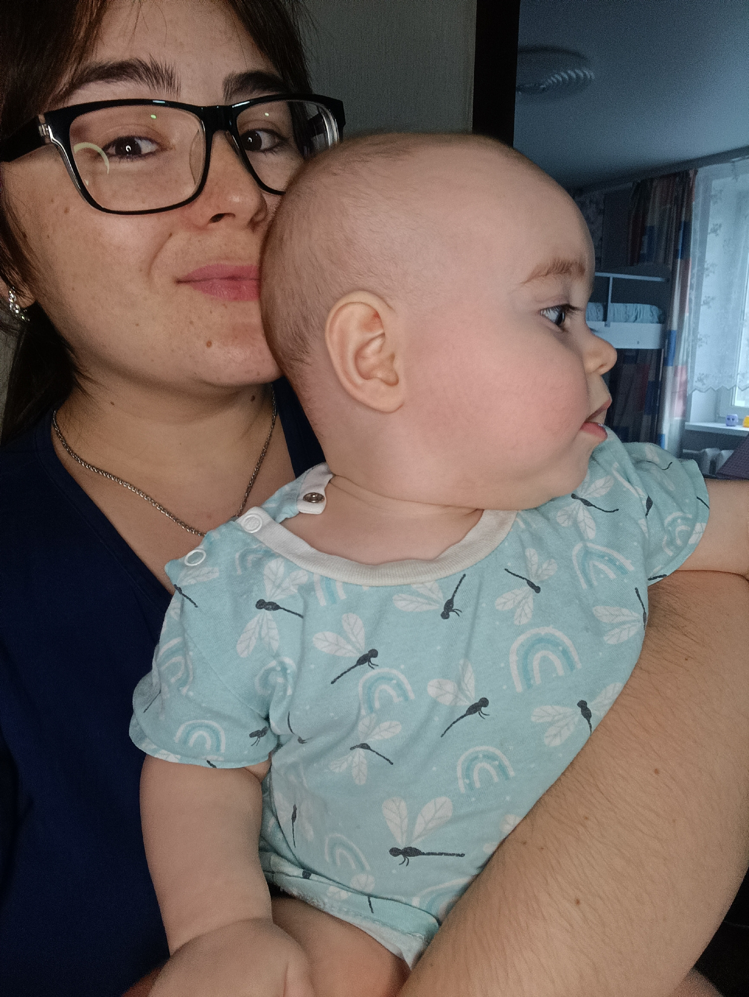 A woman with dark hair and glasses holds a baby in a light blue shirt with dragonfly and rainbow patterns. The woman wears a dark blue shirt and a silver chain necklace. The baby is looking to the rig…read more