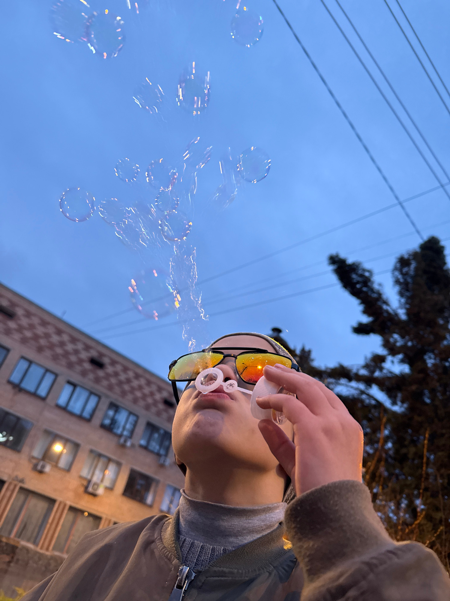 A person blows bubbles in the city of Dmitrov, Russia. The person is wearing sunglasses with a yellow reflective tint, a gray sweatshirt, and a light brown jacket. They are holding a white bubble wand…read more