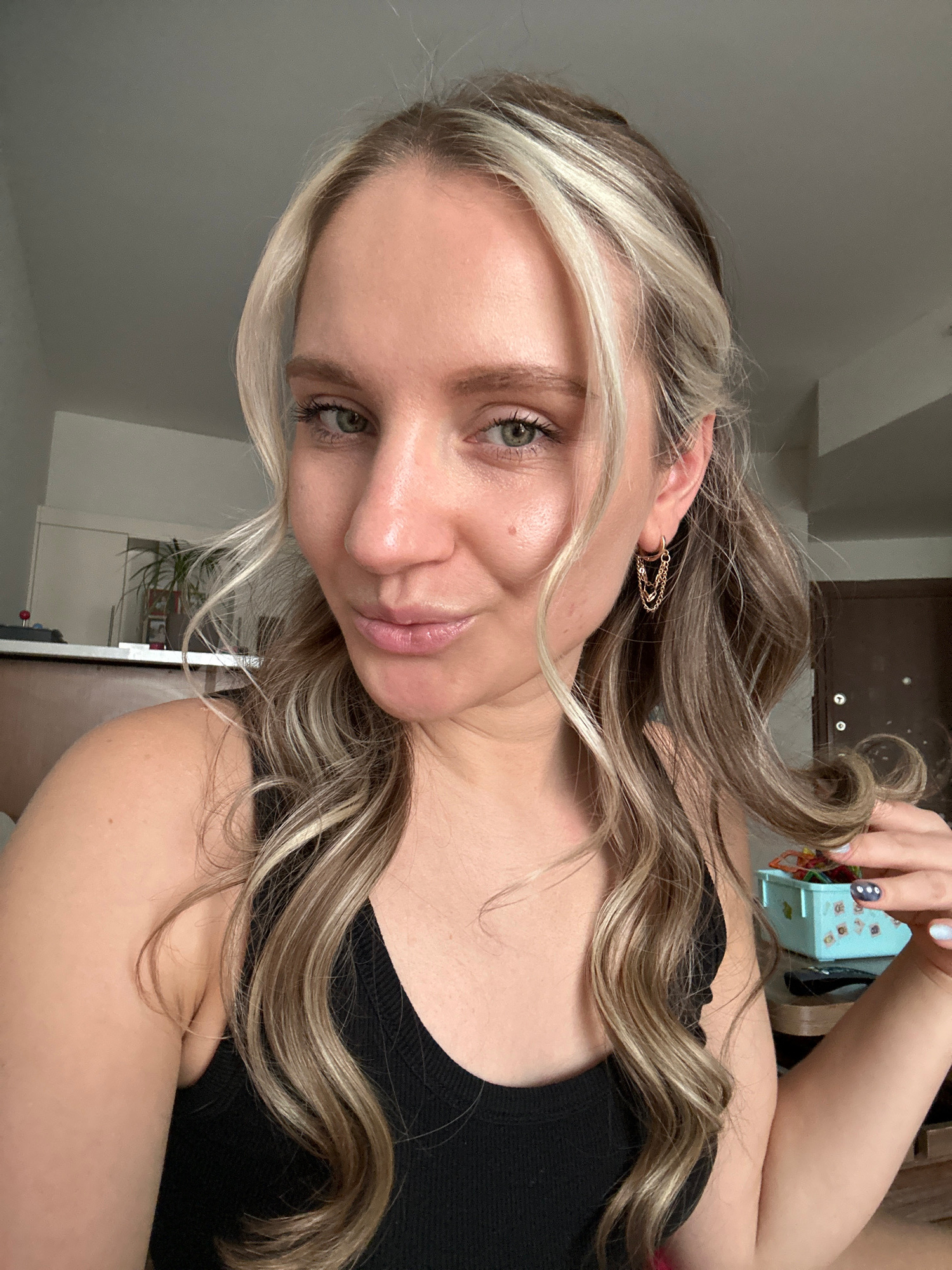 A young woman with blonde and brown hair, styled in waves, is seen in a close-up shot. She is wearing a black top and gold earrings, and she has light skin, green eyes, and is holding a small, light bβ¦read more