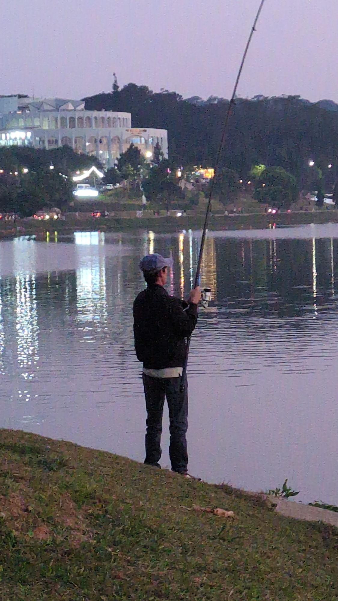 A man in a dark jacket and blue baseball cap is fishing in a lake in Da Lat, Vietnam. He stands on a grassy bank, holding a fishing rod, with a large building and street lights reflected in the water.…read more