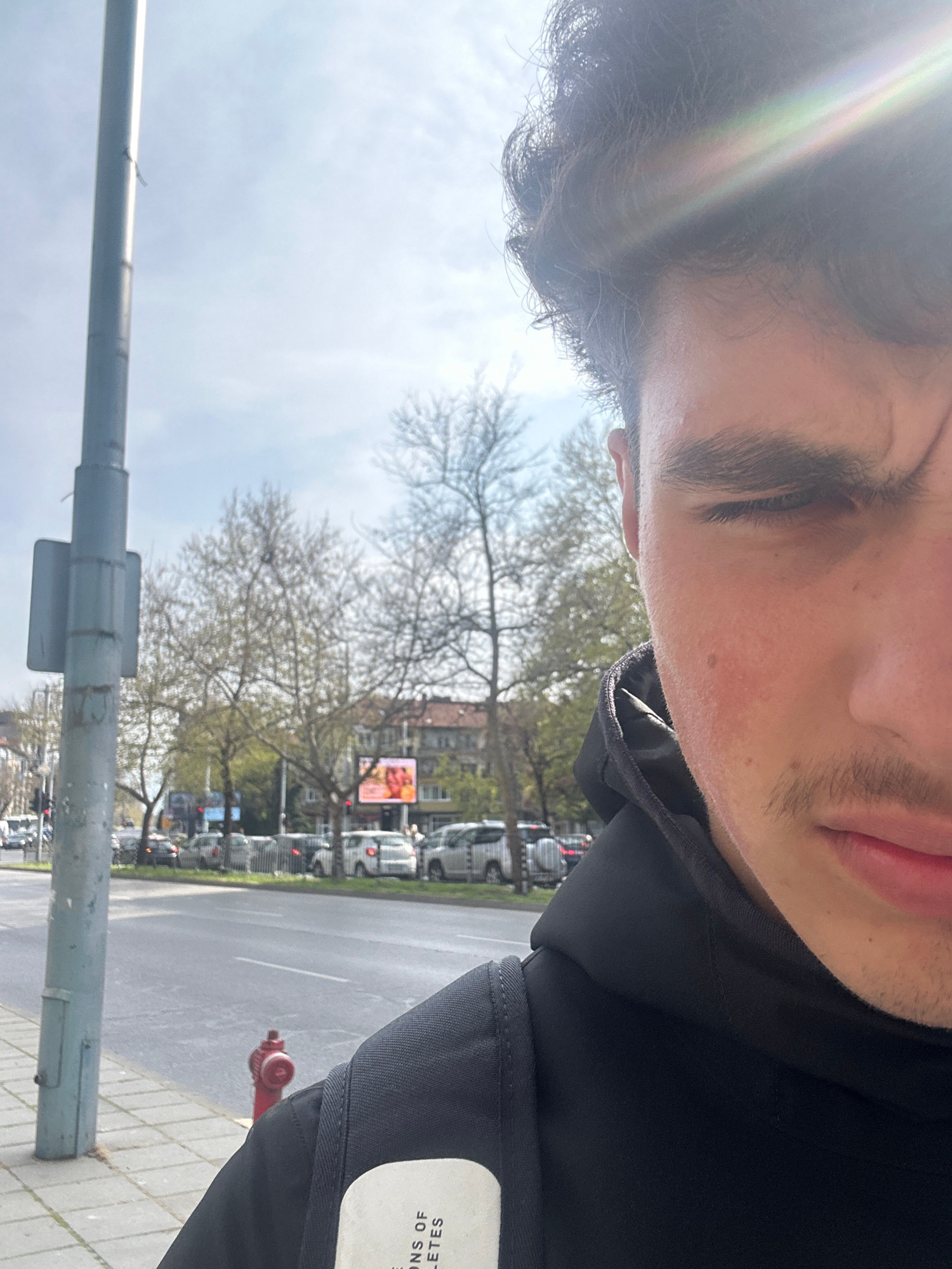 The image is taken in Plovdiv, Bulgaria, from a low-angle, tilted perspective. A portion of a person's face, including the forehead, eye, nose, and mouth, occupies the upper part of the frame. The perβ¦read more