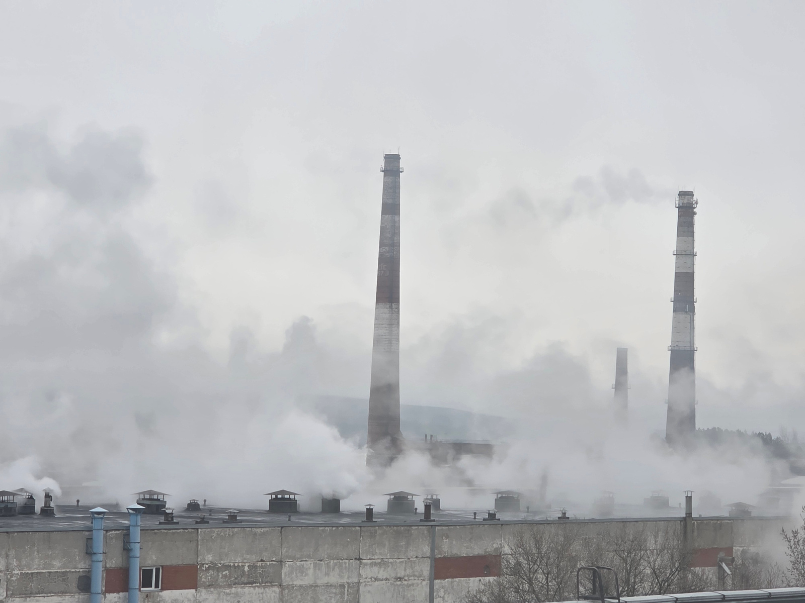 The image depicts a scene in Chaikovsky, Russia, showing industrial facilities releasing significant amounts of smoke and steam into the atmosphere. Visible are several smokestacks, some with distinct…read more