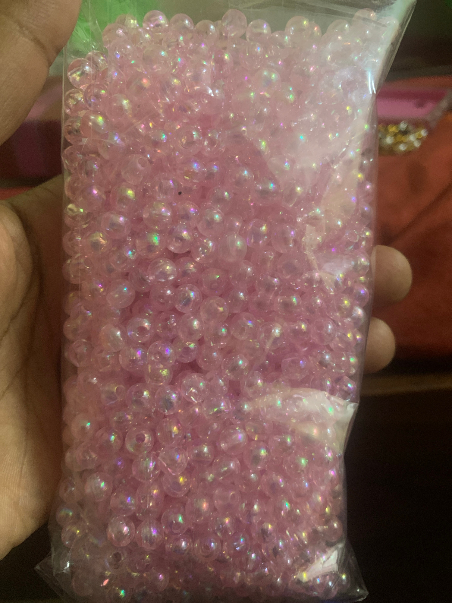 A clear plastic bag filled with numerous small, round, pinkish beads sits in the palm of a human hand. Two fingers are visible on the top of the bag. The beads appear to be translucent and possibly ir…read more