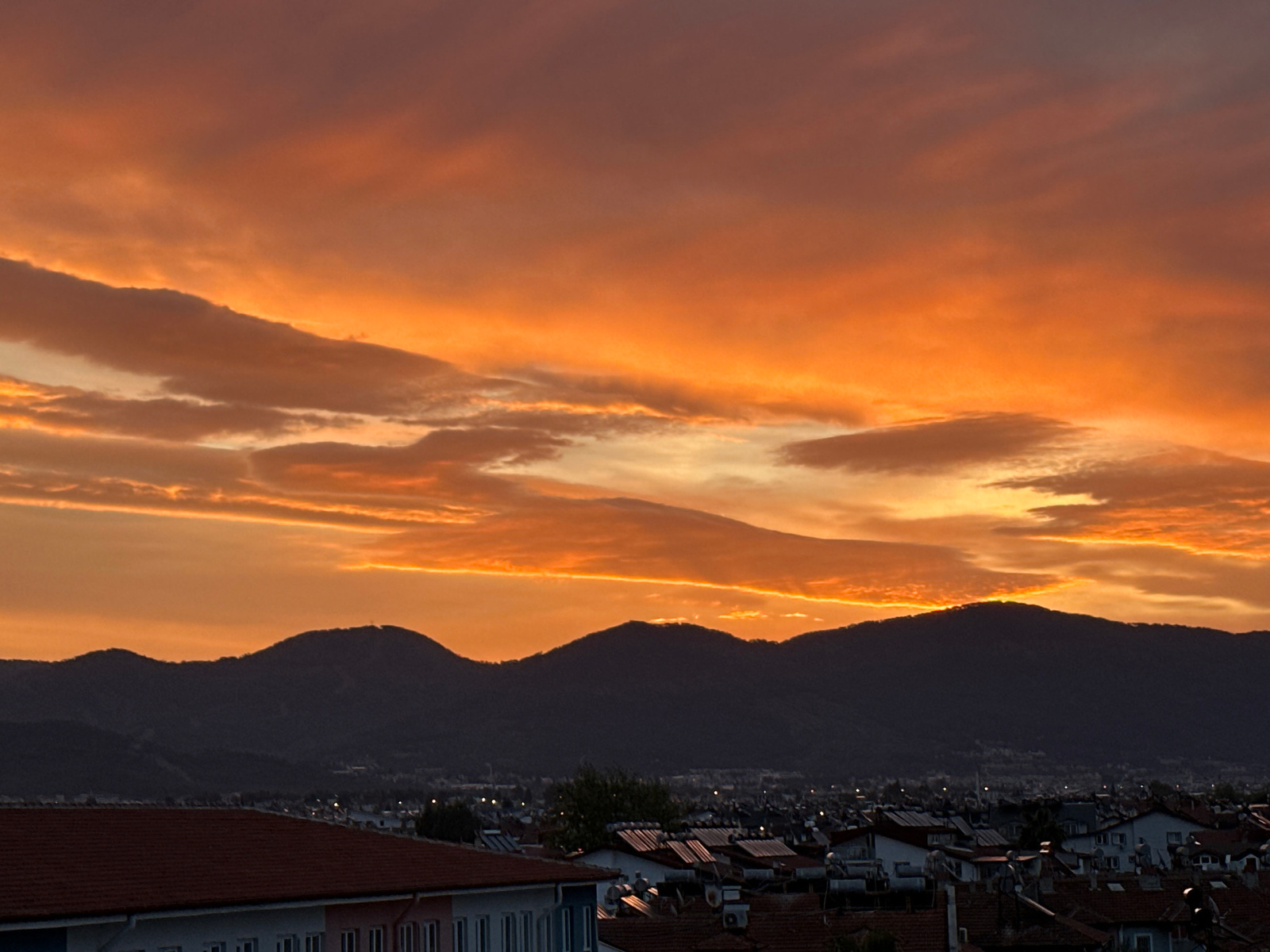 The image captures a dramatic sunset over Fethiye, Turkey. The sky is filled with orange and pink-hued clouds. Below the sky, a dark silhouette of mountains stretches across the horizon. The cityscape…read more