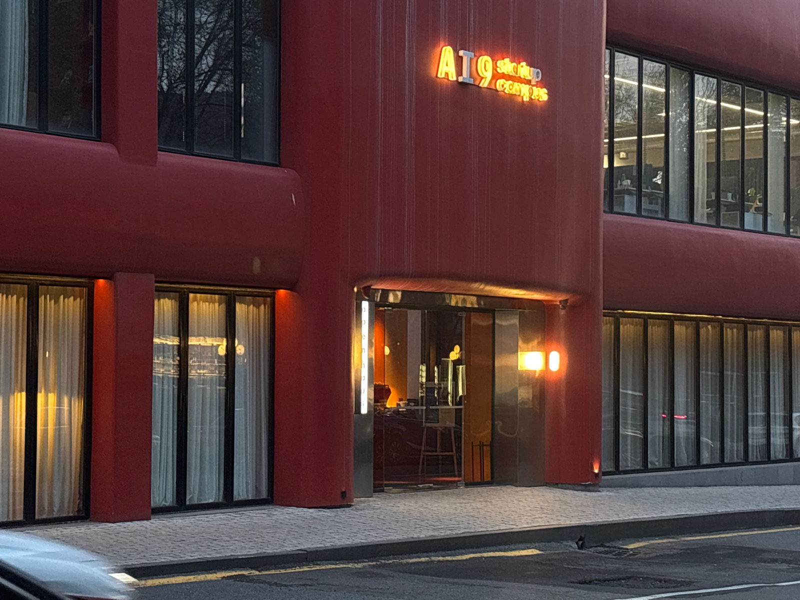 The image shows a reddish-brown building with large windows and a sign that reads "A19 startup campus". The building appears to be located on a street with a paved sidewalk and an asphalt road. The wi…read more