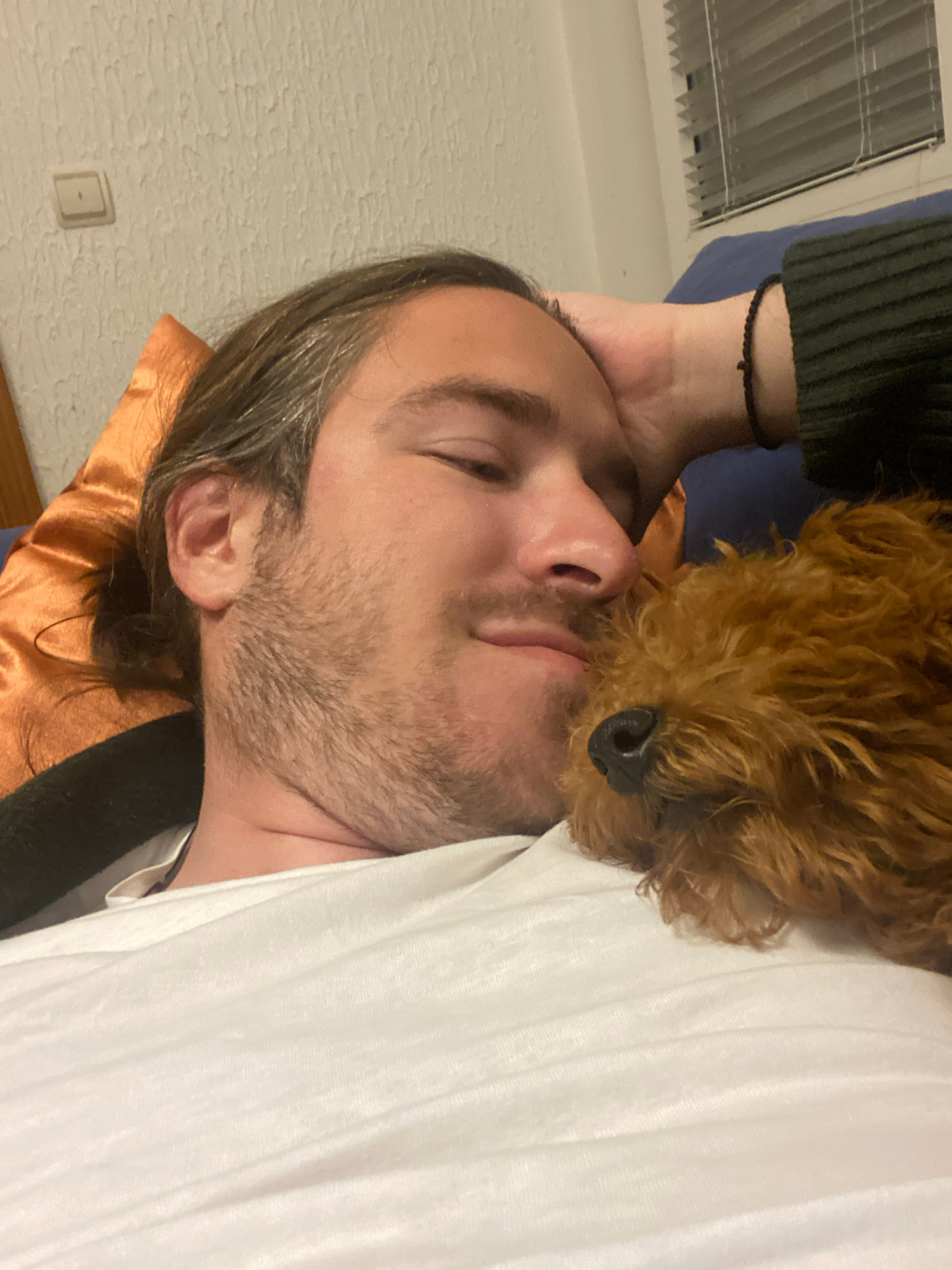 A man with long brown hair streaked with gray lies on a pillow, likely in a bedroom. He is wearing a white t-shirt. His face is turned to the right, eyes closed. A small brown poodle-like dog is nuzzl…read more