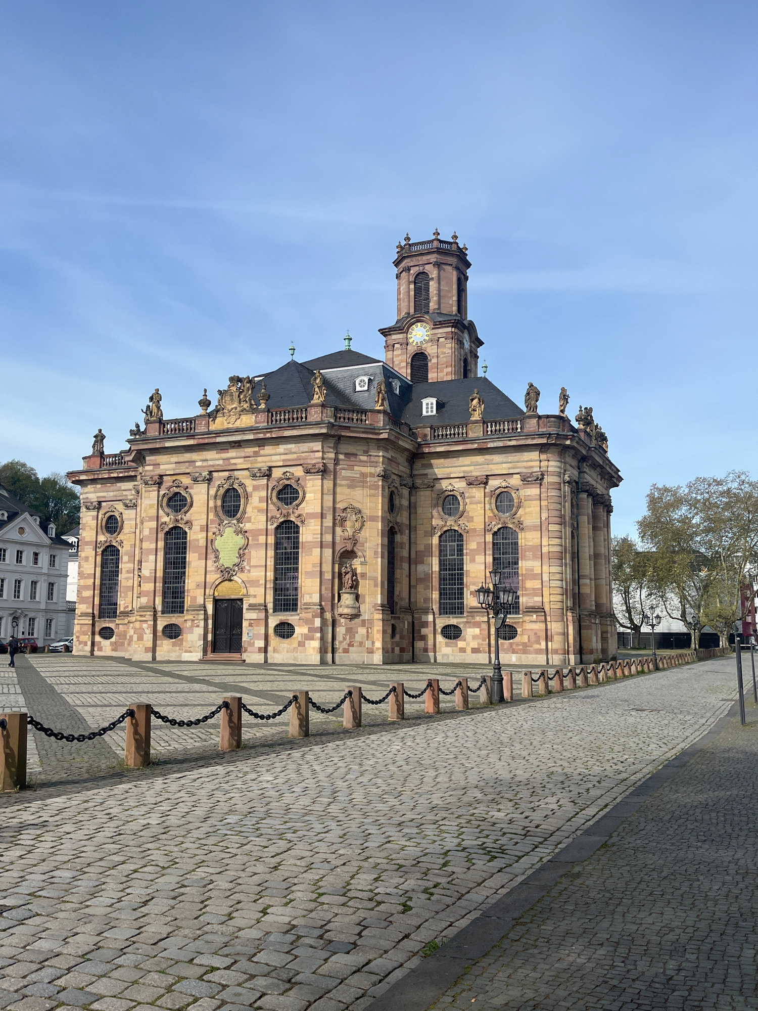The image displays a grand Baroque-style church, identified as the Ludwigskirche in Saarbrücken, Germany, under a bright, clear blue sky. The church features a multi-toned facade of sandstone, exhibit…read more