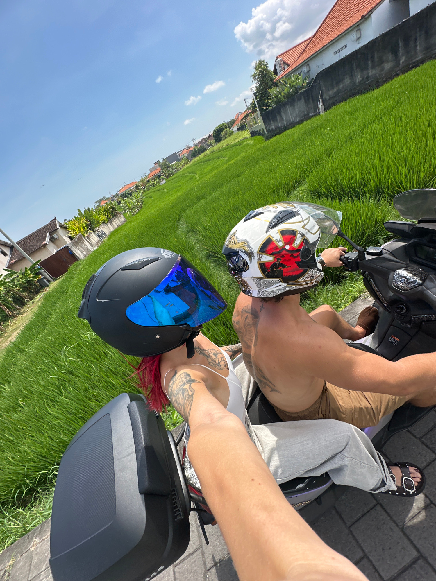 Two individuals are on a parked motorcycle. The man, shirtless with arm tattoos, wears a white helmet with red and gold designs. The other individual wears a black helmet with a blue visor and has redβ¦read more