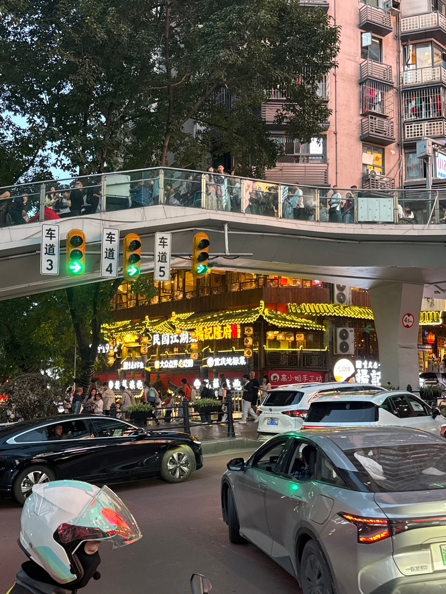 The image depicts a street scene in the Yuzhong District of Chongqing, China. It shows a mix of old and new architecture, with traditional Chinese-style buildings adorned with bright neon lights along…read more