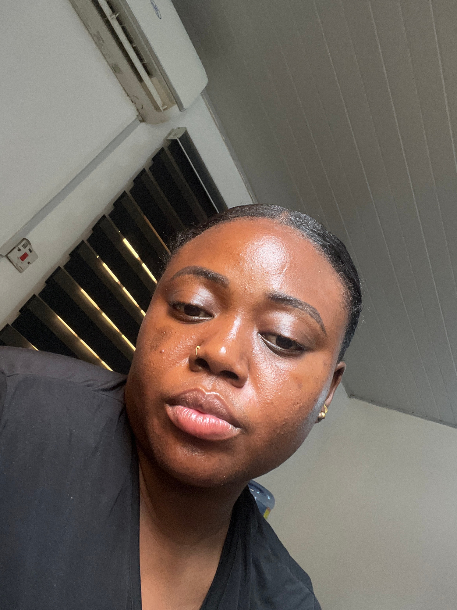 A close-up, angled shot of a woman with dark skin and short, dark hair. She is wearing a black shirt and a gold nose ring in her left nostril, as well as gold earring. Her head is tilted to the right.…read more