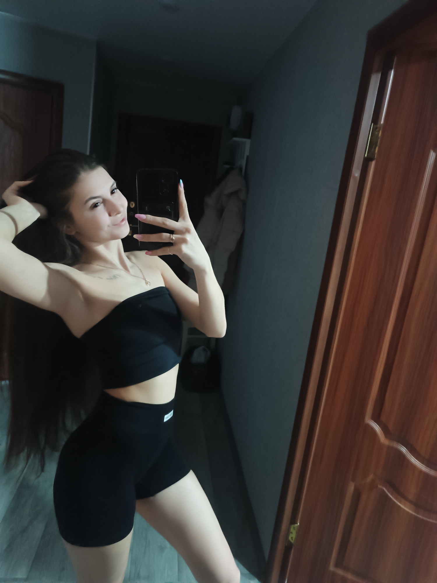 A woman is taking a selfie in what appears to be an indoor environment. She is wearing a black strapless crop top and black shorts. Her hair is long and dark. She's holding a smartphone in her right h…read more