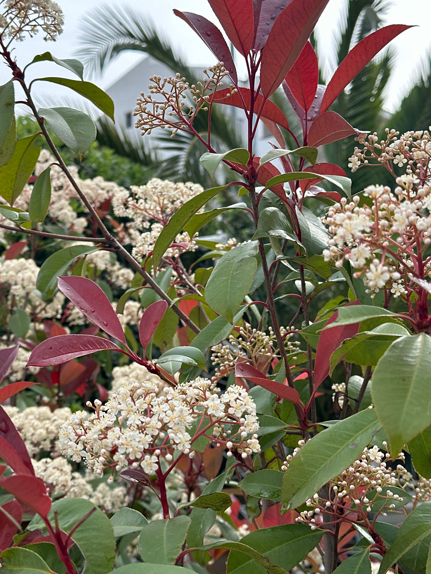 A close-up shot of a plant with red and green leaves and small white flowers, likely in Šušanj, Montenegro. The red leaves are concentrated on the left side of the frame, while the green leaves and wh…read more