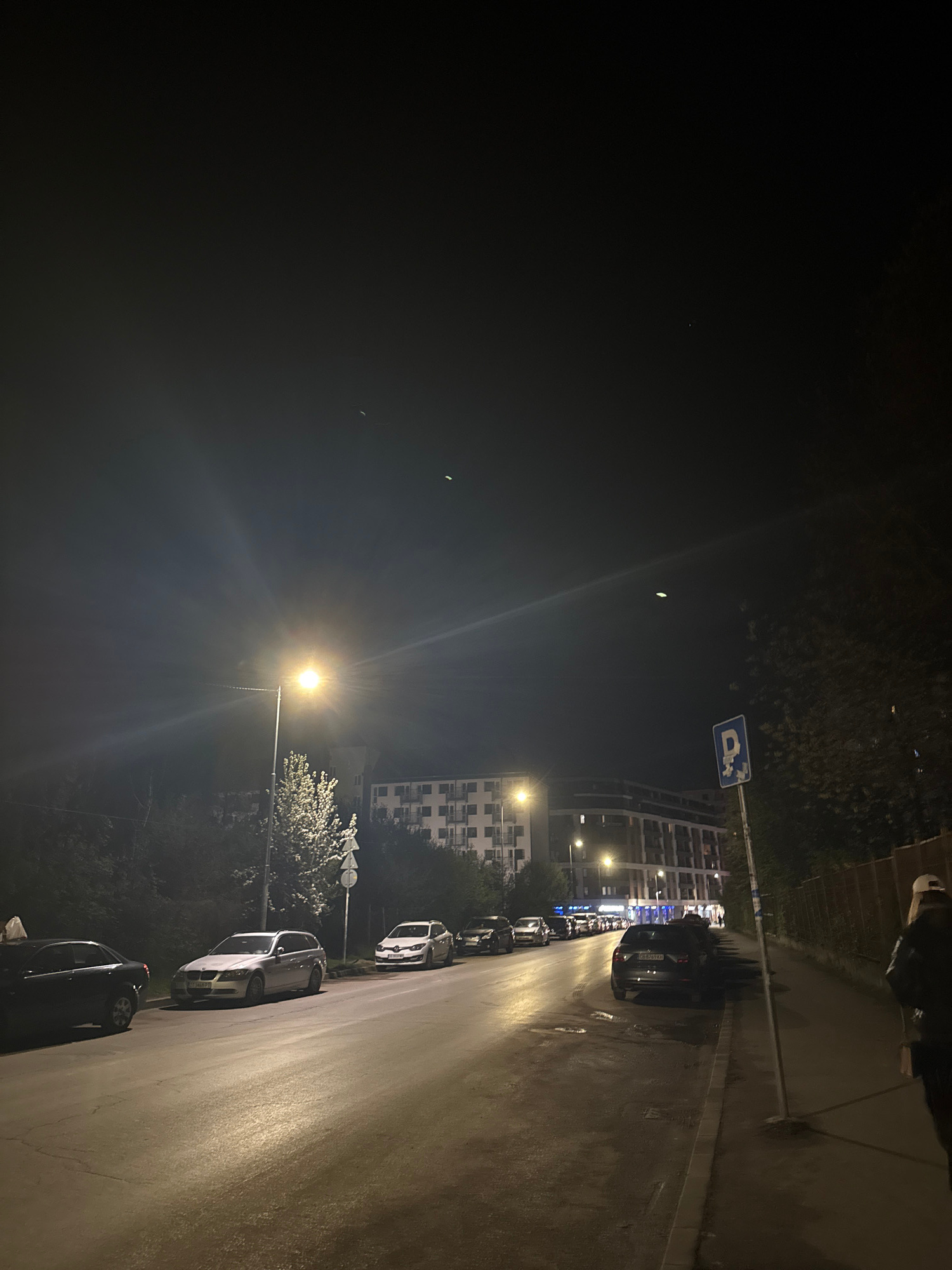 The image shows a nighttime street scene in Sofia, Bulgaria. The photo is taken from a standing height looking down the street. The road is lined with parked cars on one side and a sidewalk. A street…read more