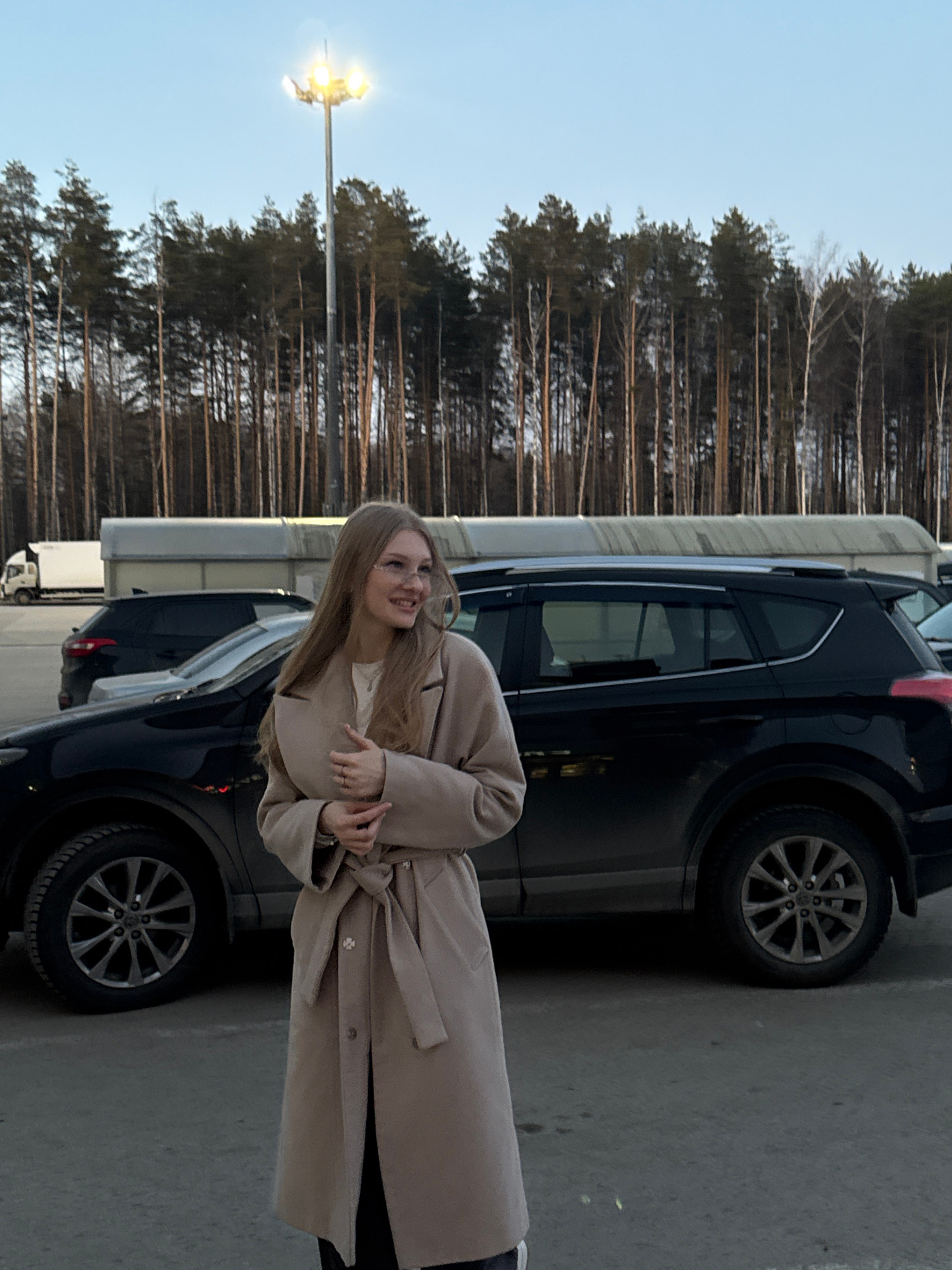 A woman in a beige trench coat stands next to a dark-colored SUV in what appears to be a parking lot. The background features a row of trees and streetlights, suggesting an urban or suburban environme…read more