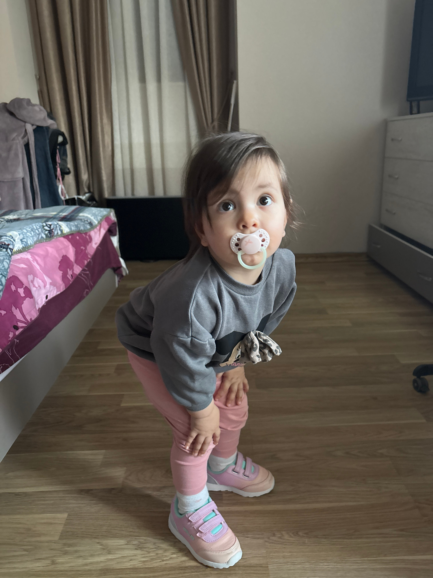 A young child with a pacifier sits on a wood floor in a room in Plovdiv, Bulgaria. The child wears a gray sweatshirt with a decorative bow, pink pants, pink and lavender shoes, and white socks. A part…read more