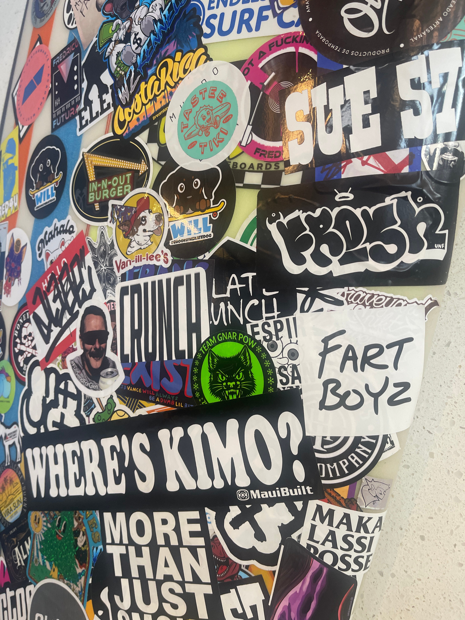 The image displays a close-up of a densely covered surface, possibly a wall, board, or other object, adorned with an overlapping collage of numerous stickers. The collection features a variety of desiβ¦read more