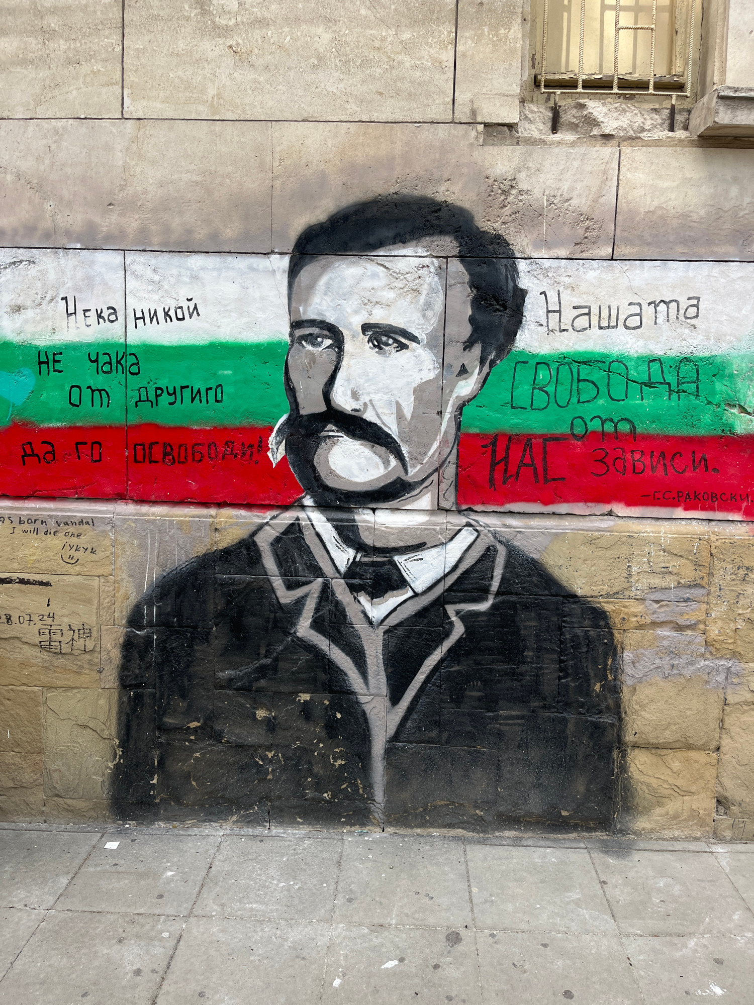 The image shows a wall mural in Burgas, Bulgaria. The mural depicts a portrait of a man with a mustache, likely a historical figure. Adjacent to the portrait are the colors of the Bulgarian flag – whi…read more
