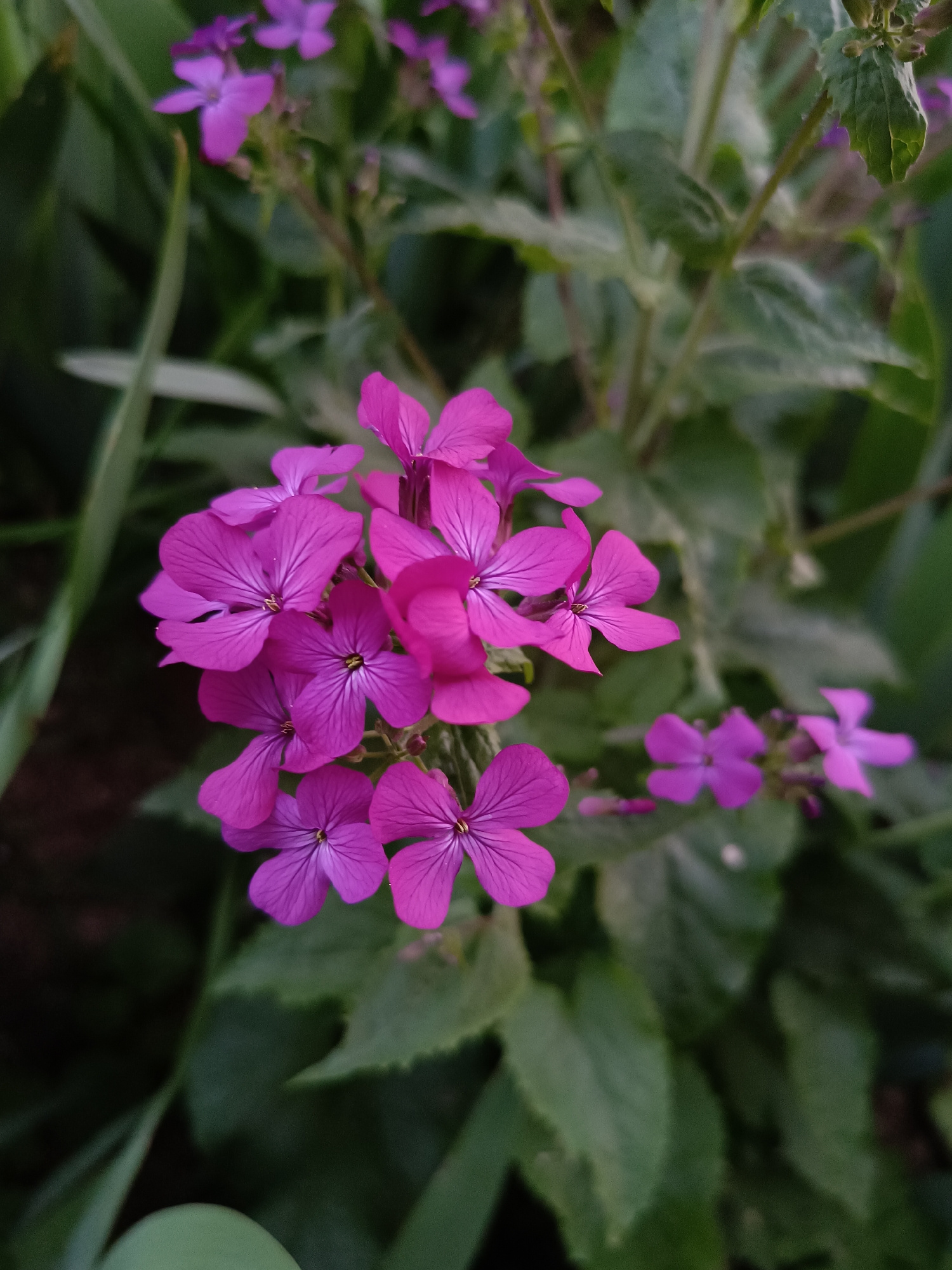 The image captures a vibrant close-up of a cluster of purple-pink flowers, likely Honesty (Lunaria annua) or a similar four-petaled species, set against a soft, out-of-focus background of green foliag…read more