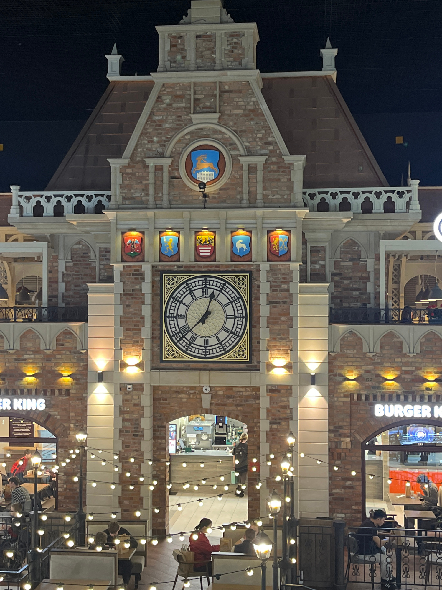 The image depicts a building facade with a large clock, located within a Burger King restaurant in the city of Hrodna, Belarus. The facade is designed in a style reminiscent of European architecture,…read more