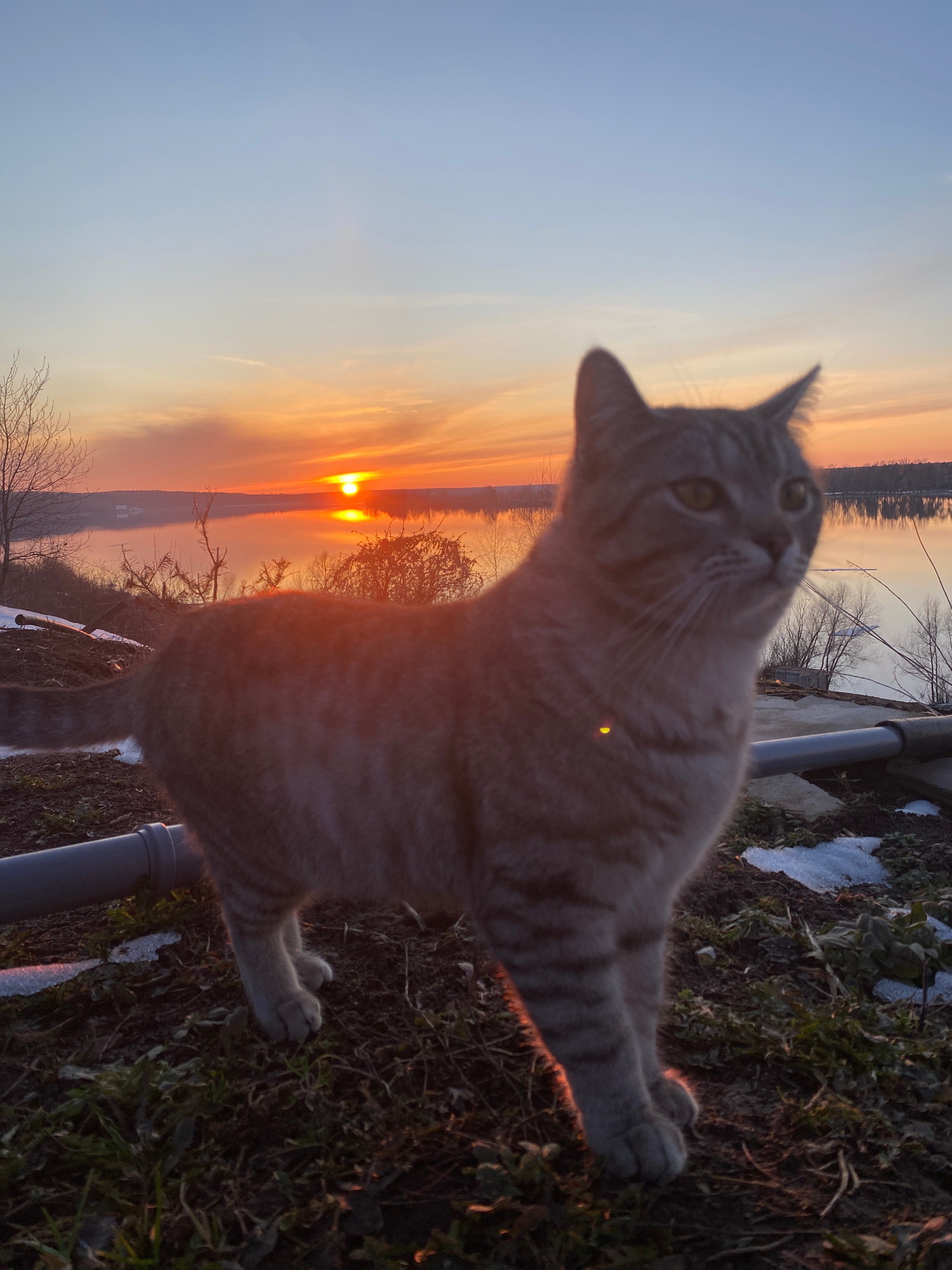 The image shows a tabby cat with a sunset in the background. The location is near Ольховка, Russia, as evidenced by the landscape and vegetation. The cat is in focus, looking upwards. The sunset creat…read more