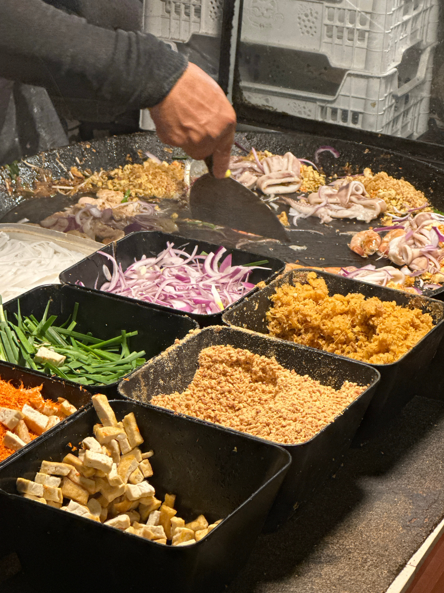 A bird's-eye-view shot shows a person cooking a street food dish in Pattaya City, Thailand. The cook, seen with a bare hand and part of an arm clad in a dark sweater, is using a flat spatula to mix inβ¦read more